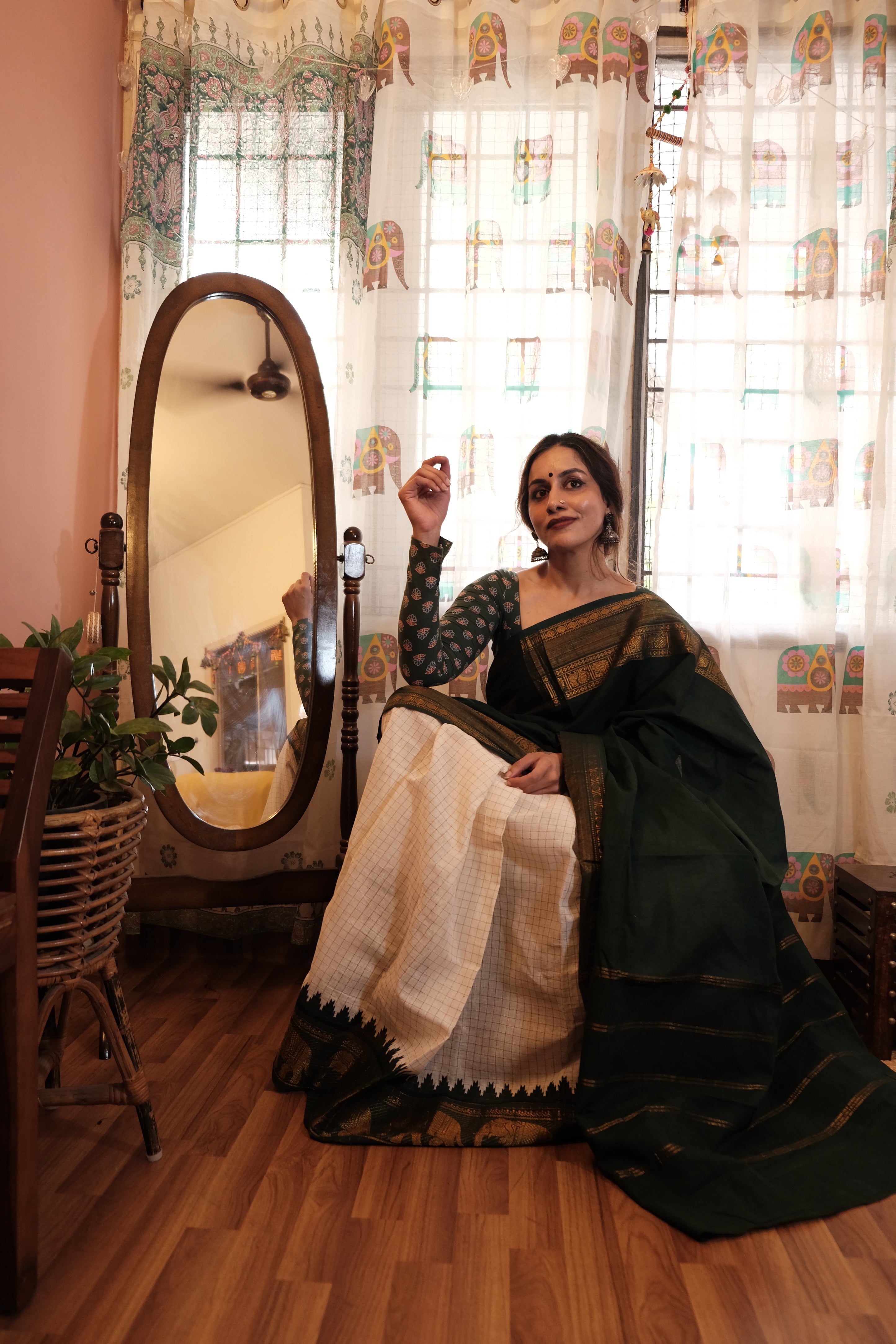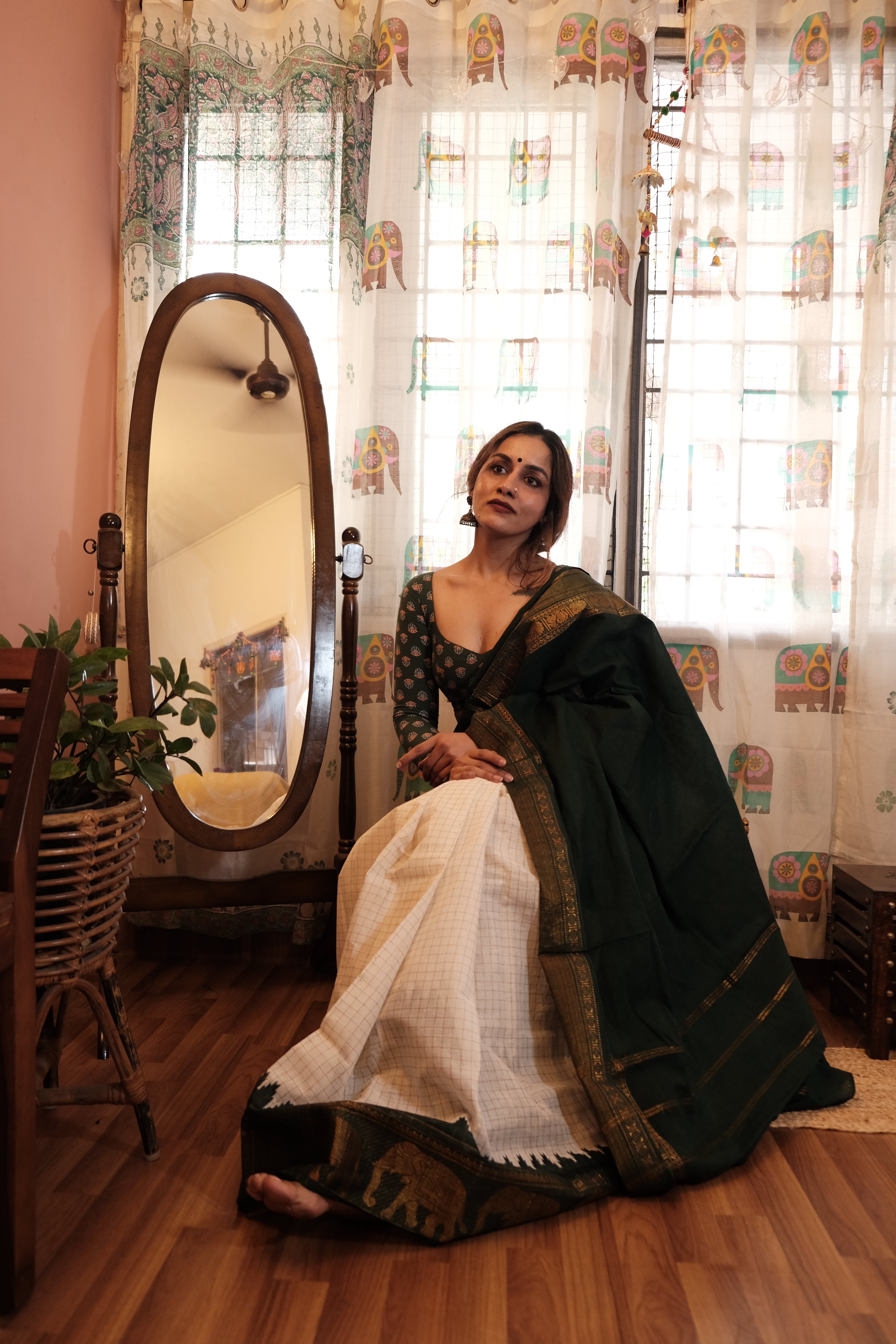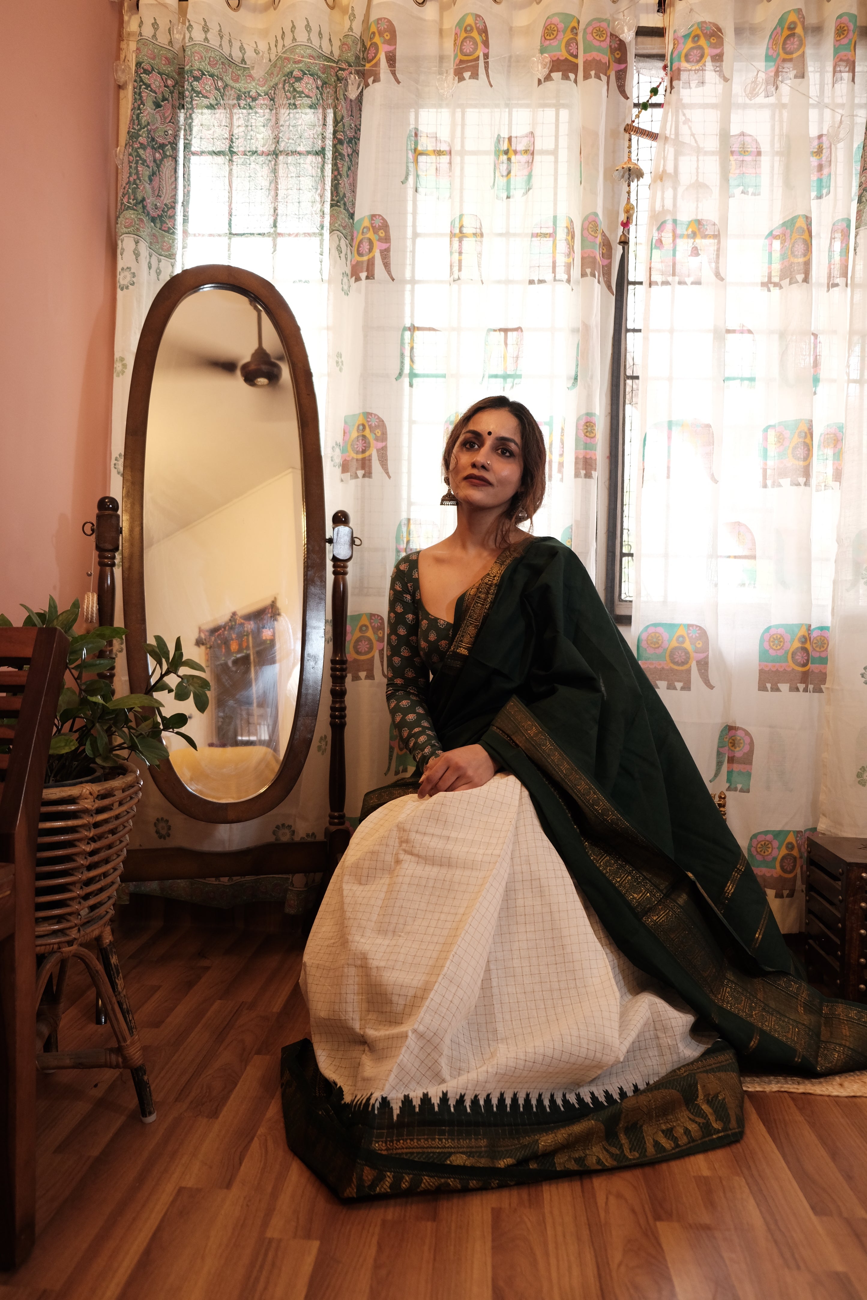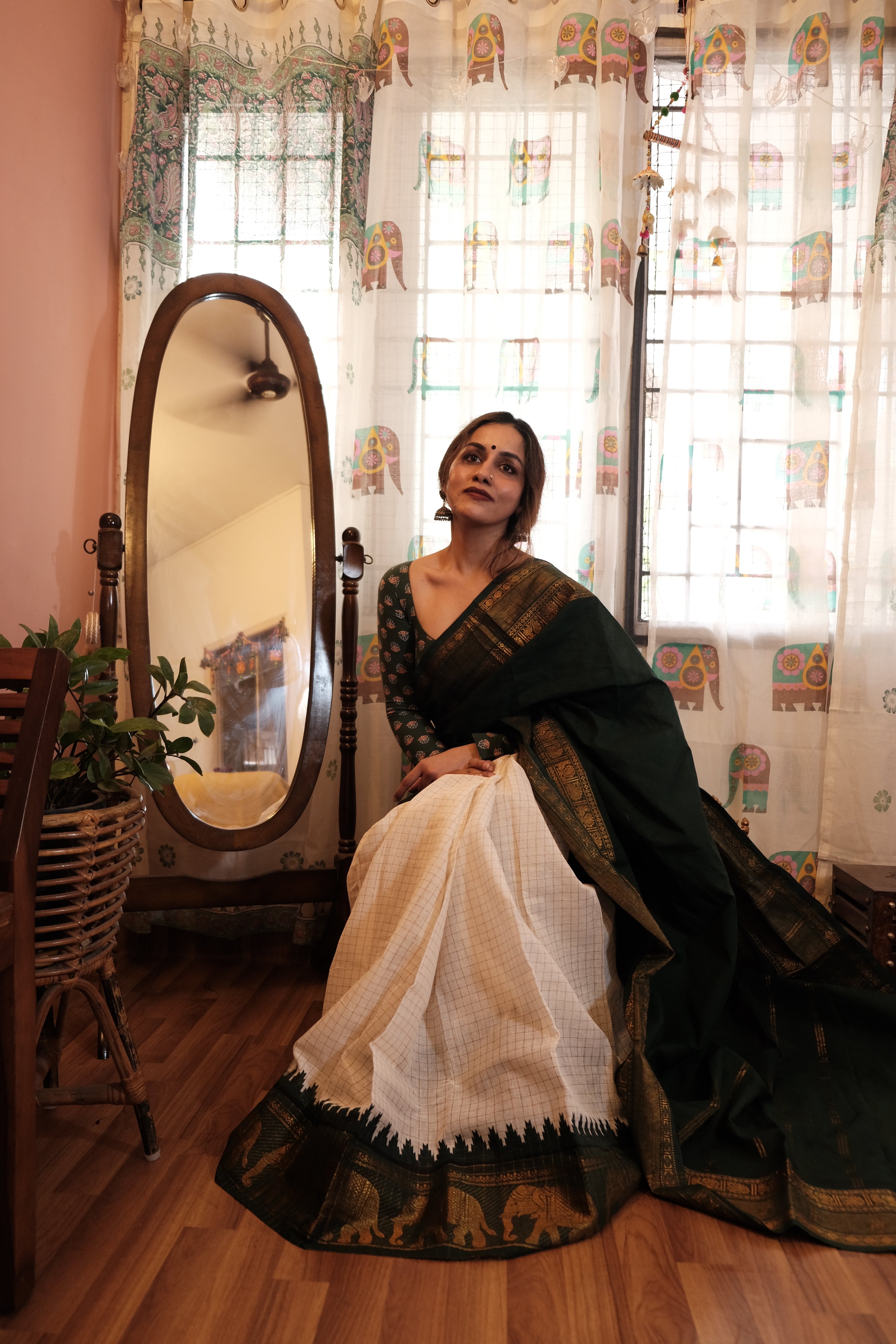 - Dark Green Velthari Pallu | Checkered White with Green Zari Body