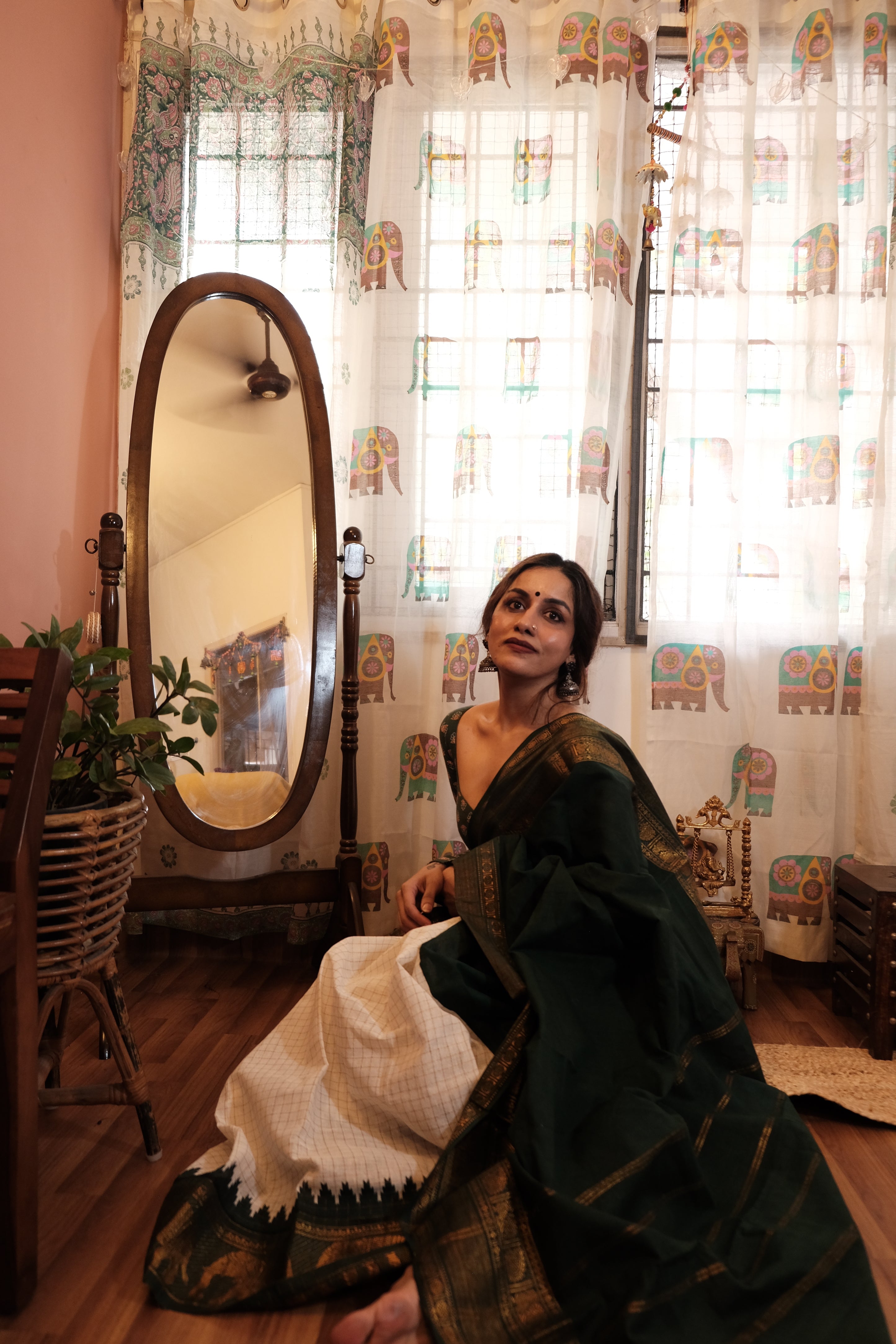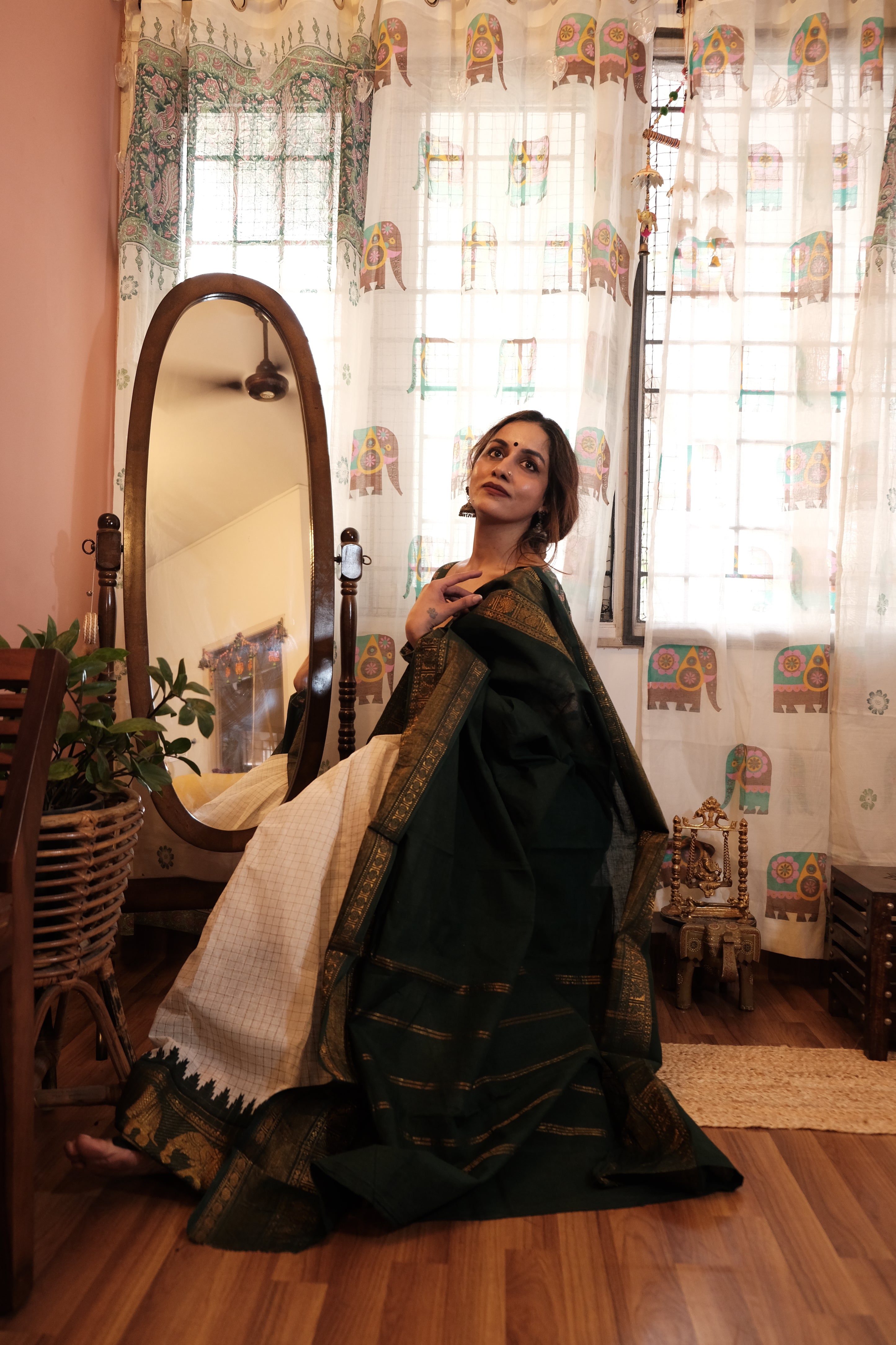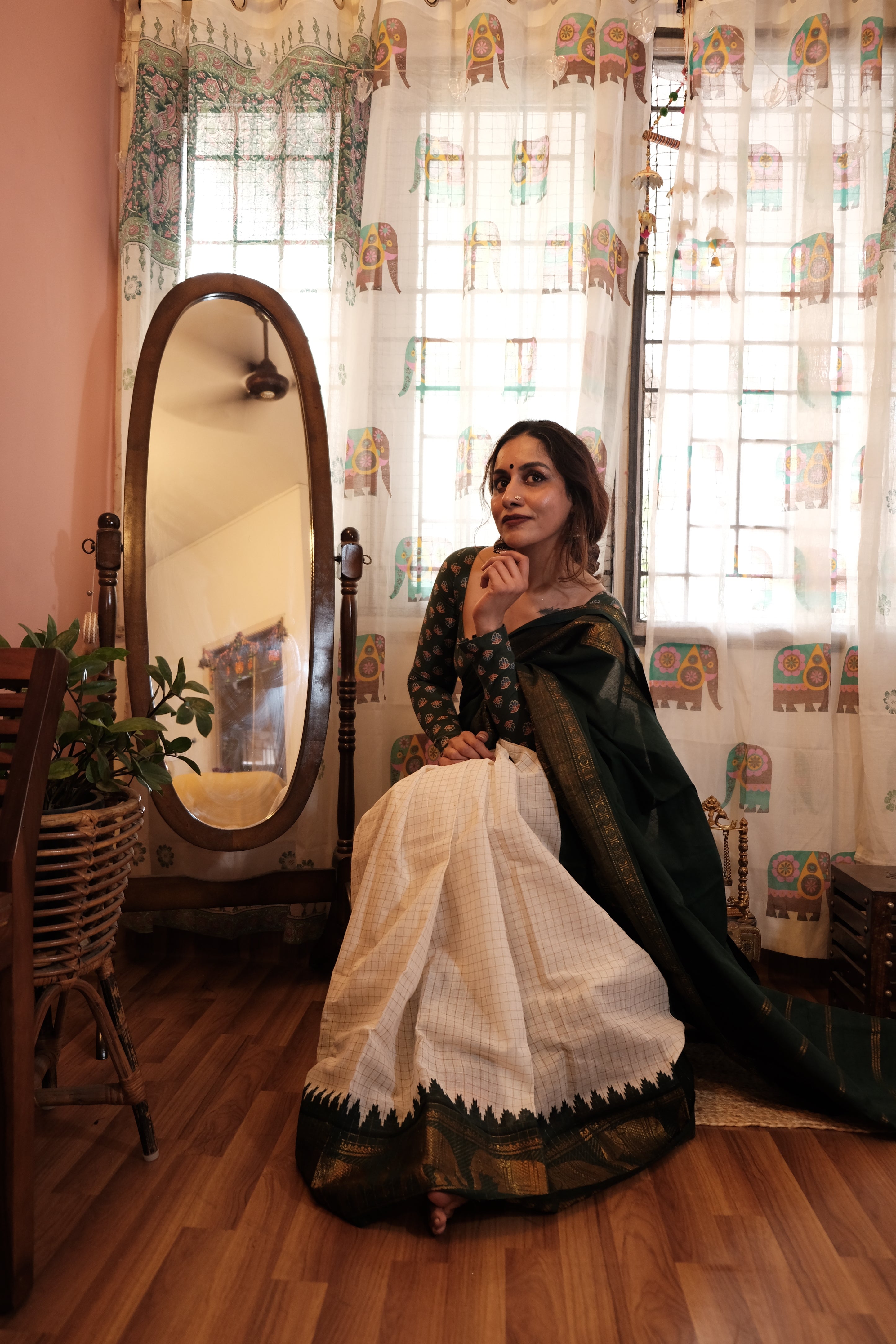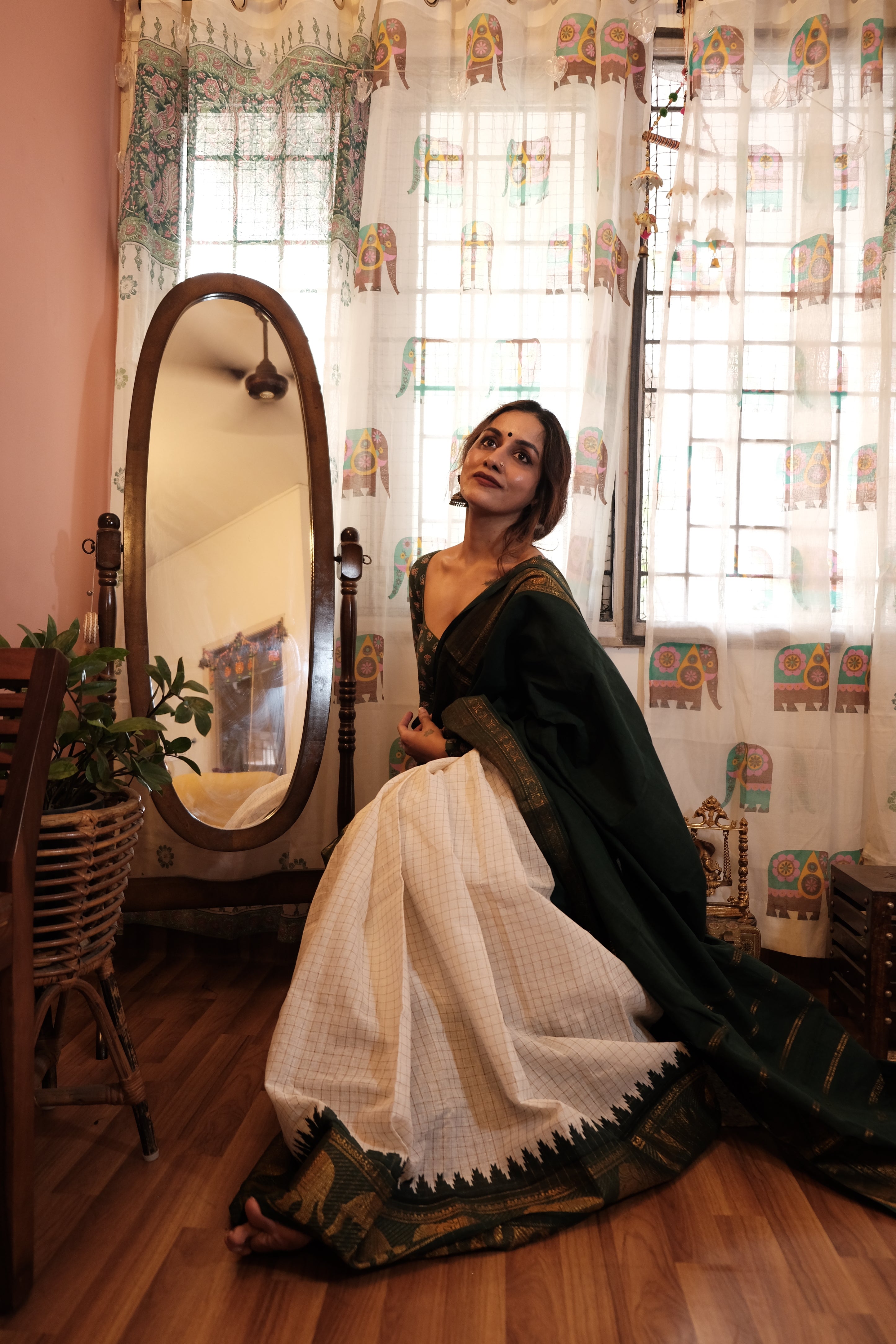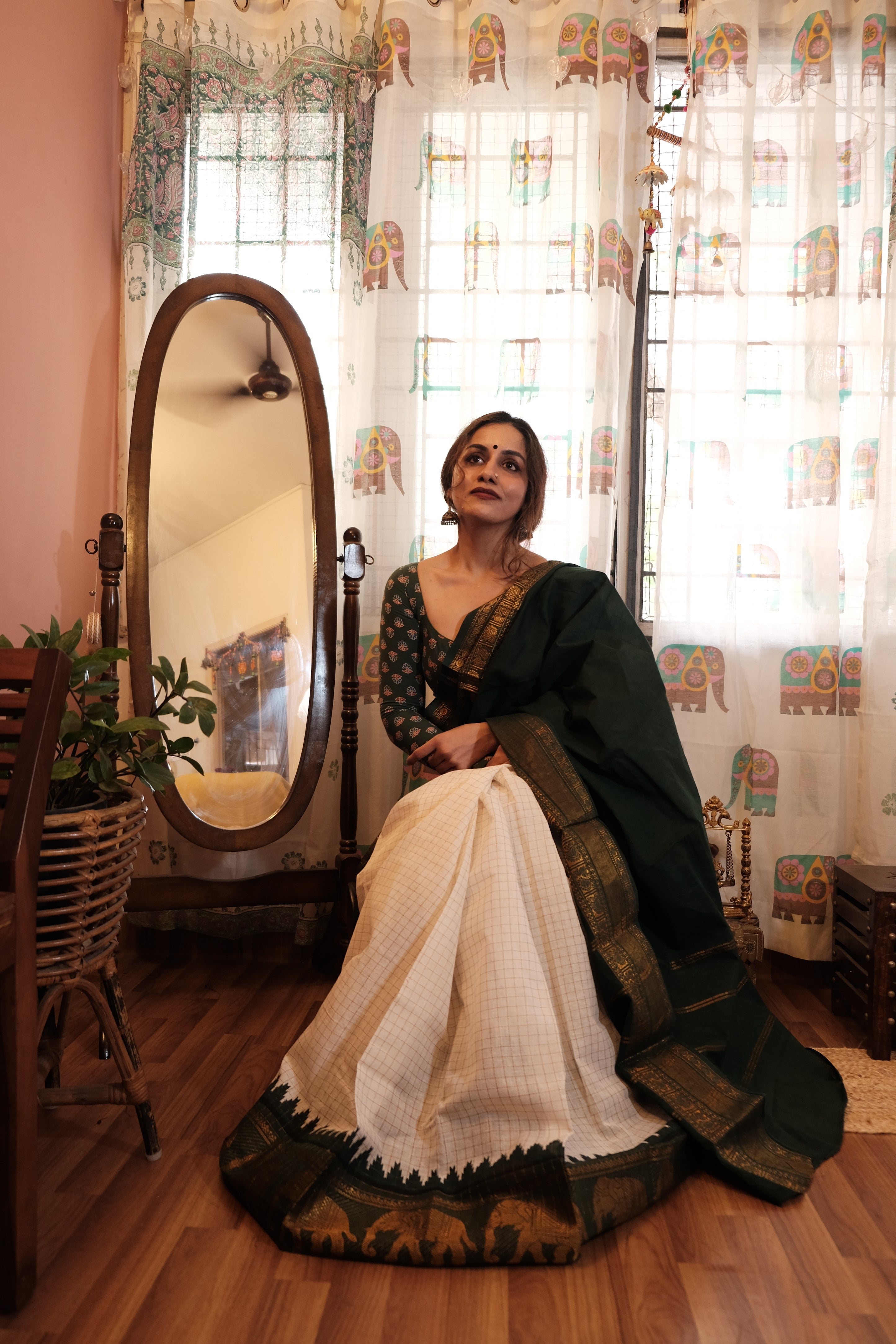 - Dark Green Velthari Pallu | Checkered White with Green Zari Body