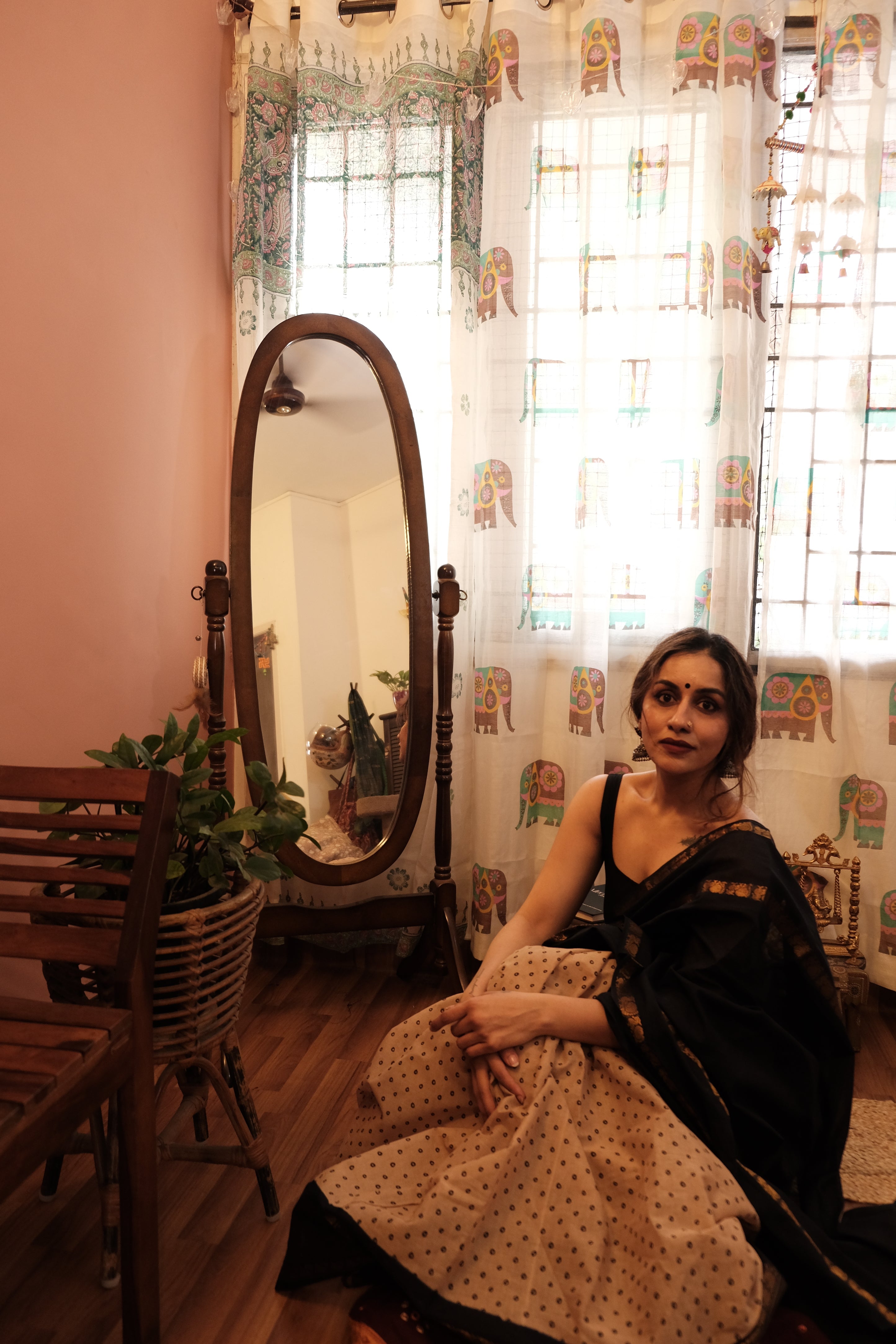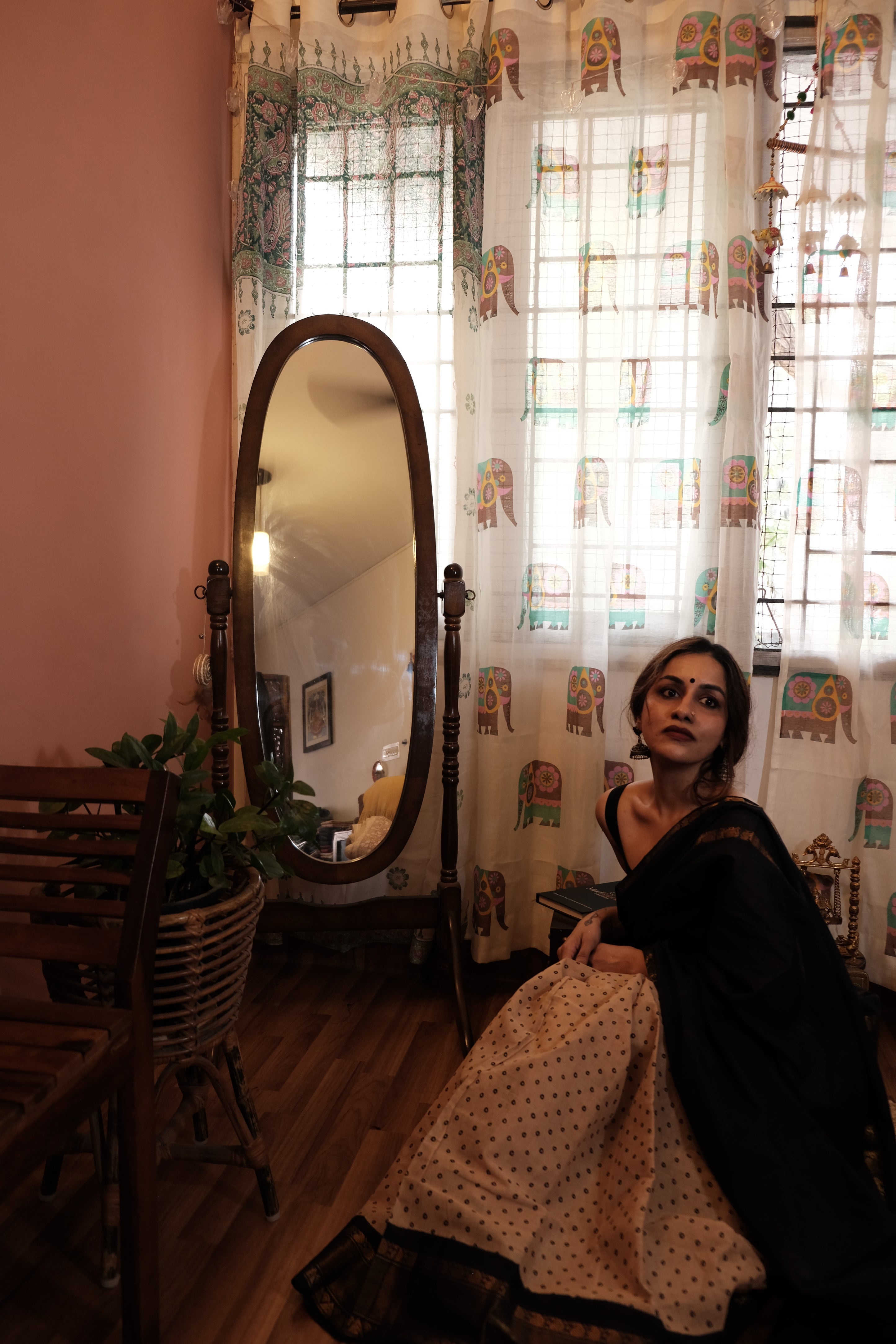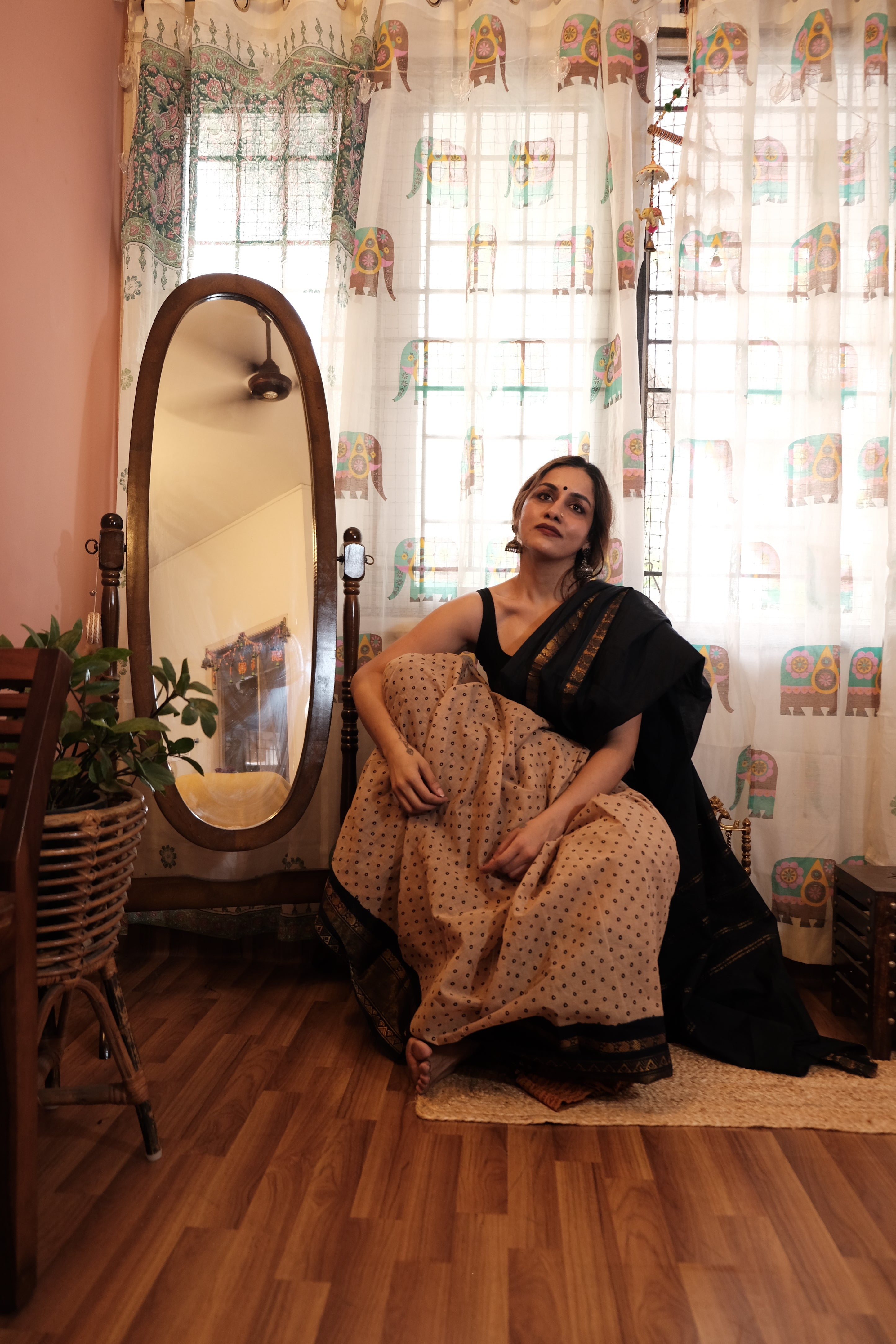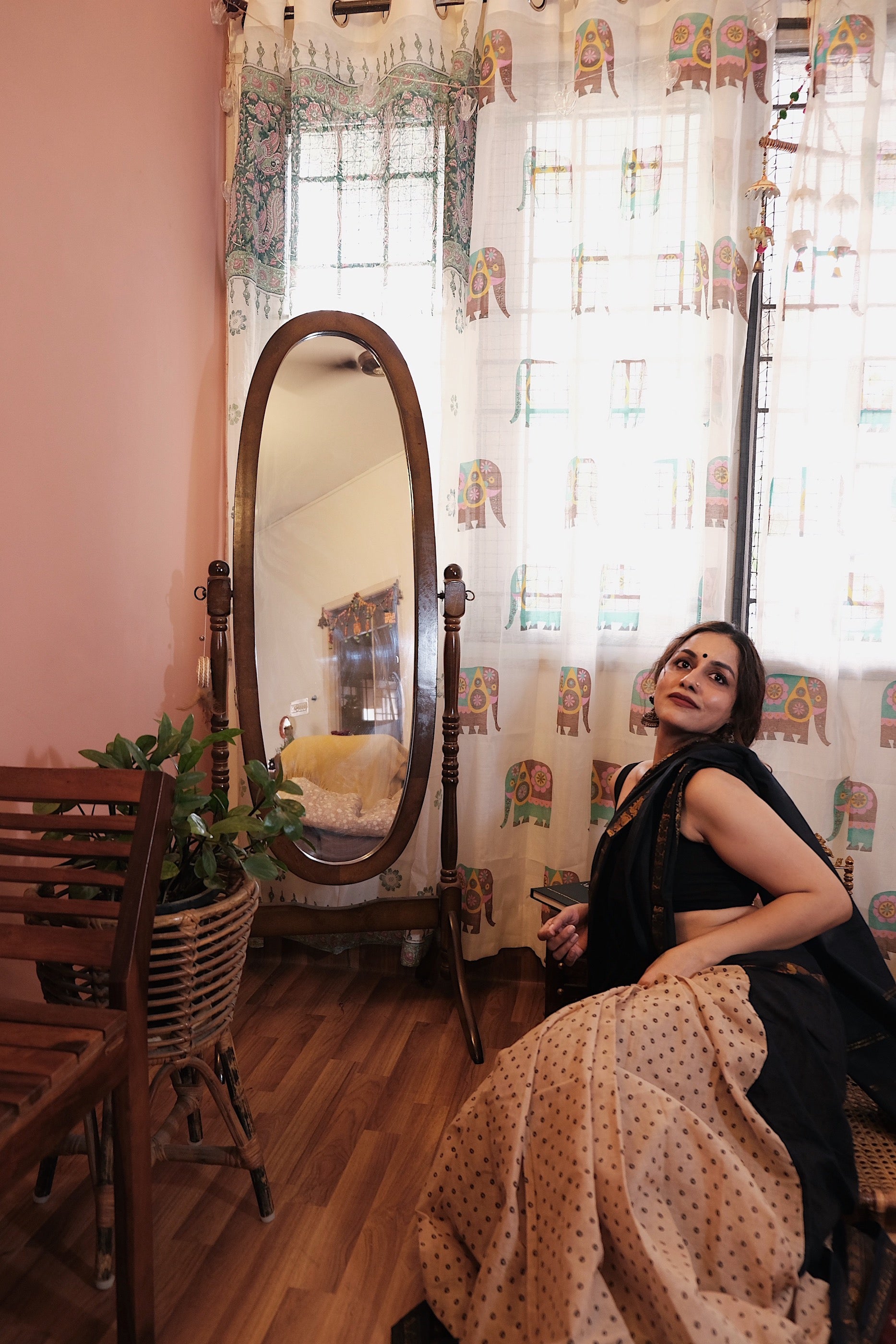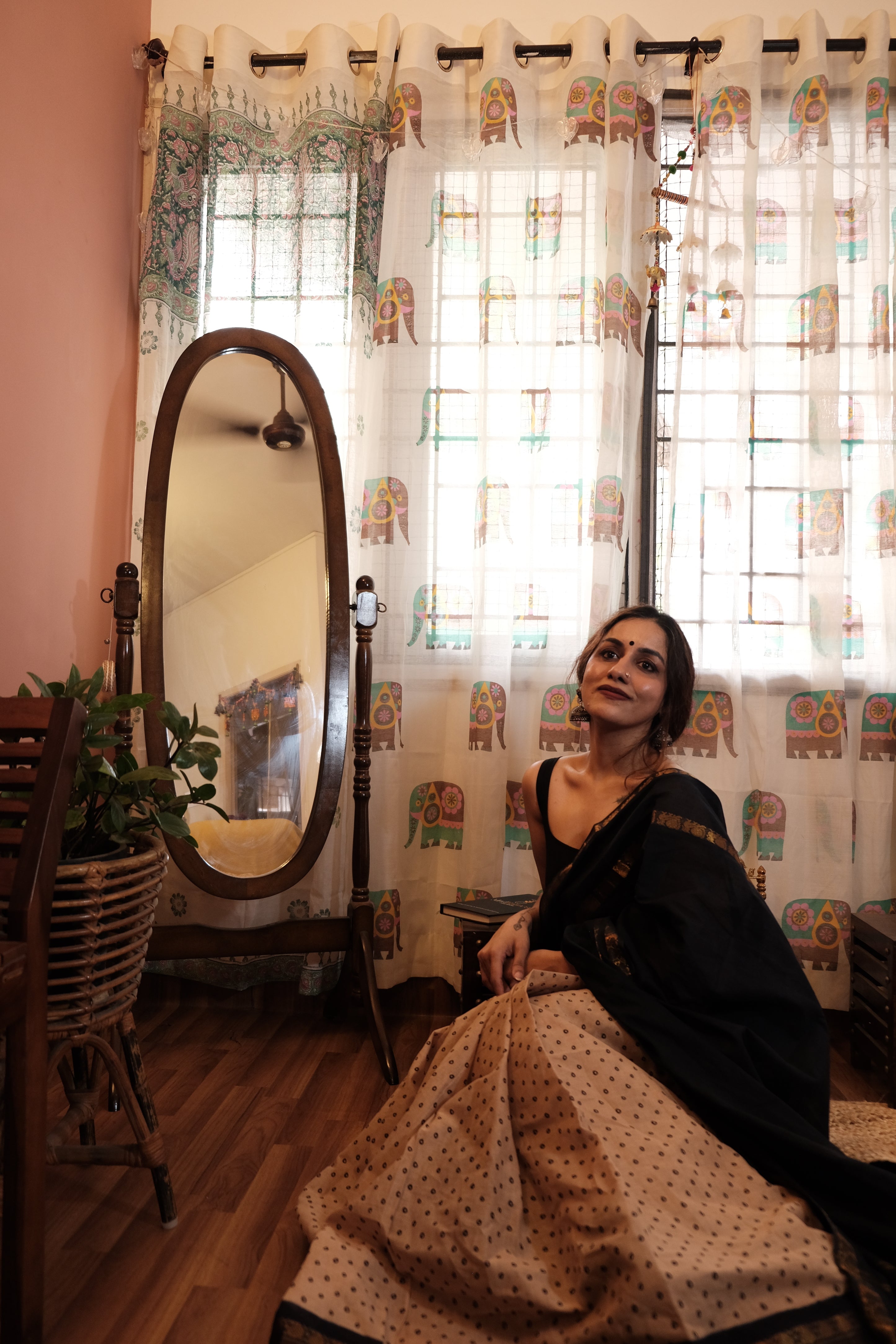 - Some Laya sarees are created by joining fabrics of different heights. In these pieces, the taller fabric has been folded to align with the shorter one. This fold remains tucked in at the waist when draped and does not affect the look or flow of the saree. The construction is intentional, allowing each fabric to retain its character while bringing the design together.