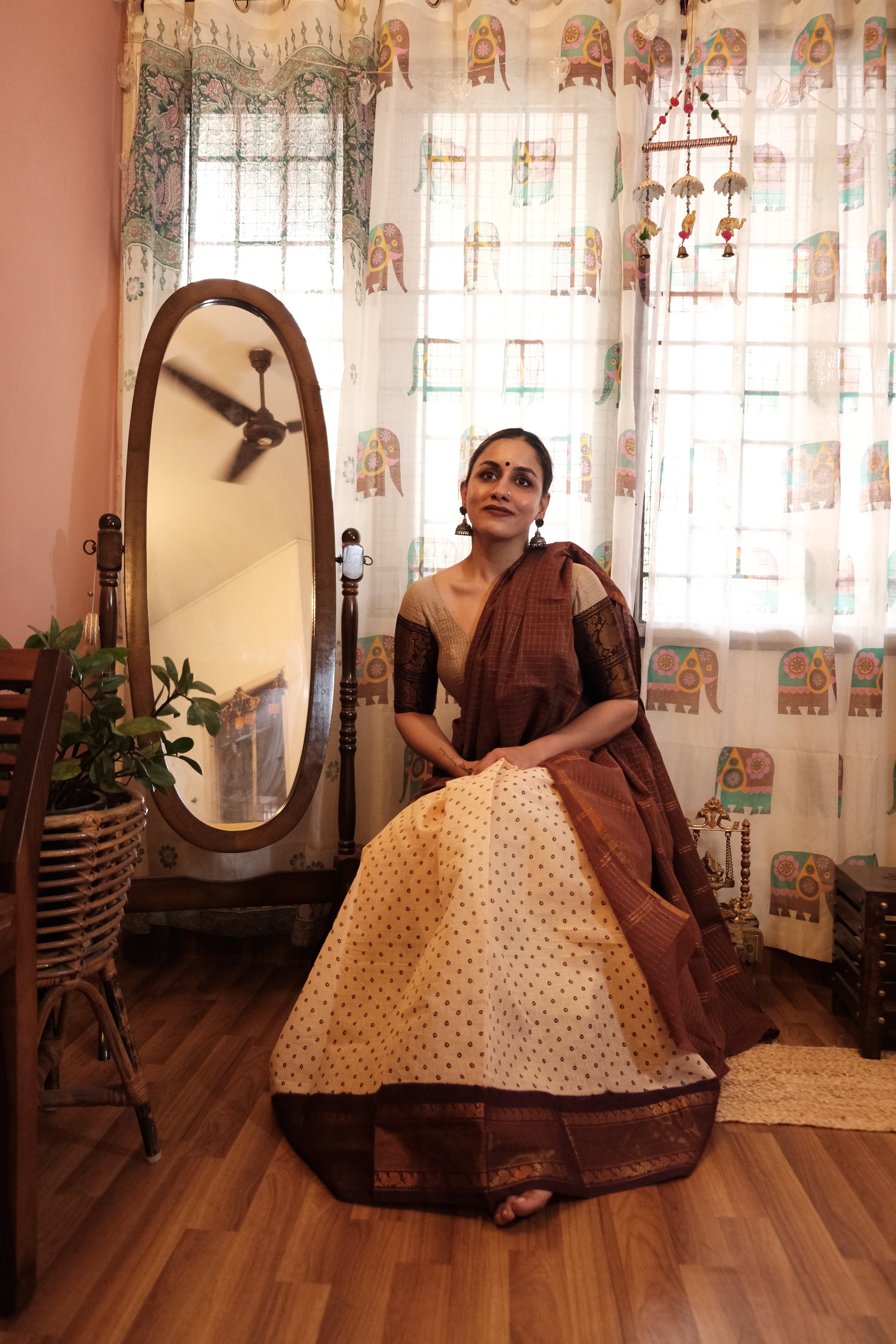 - Coffee Brown Podi Kattam Palu | Blushing Apricot Sungudi with Maroon Zari