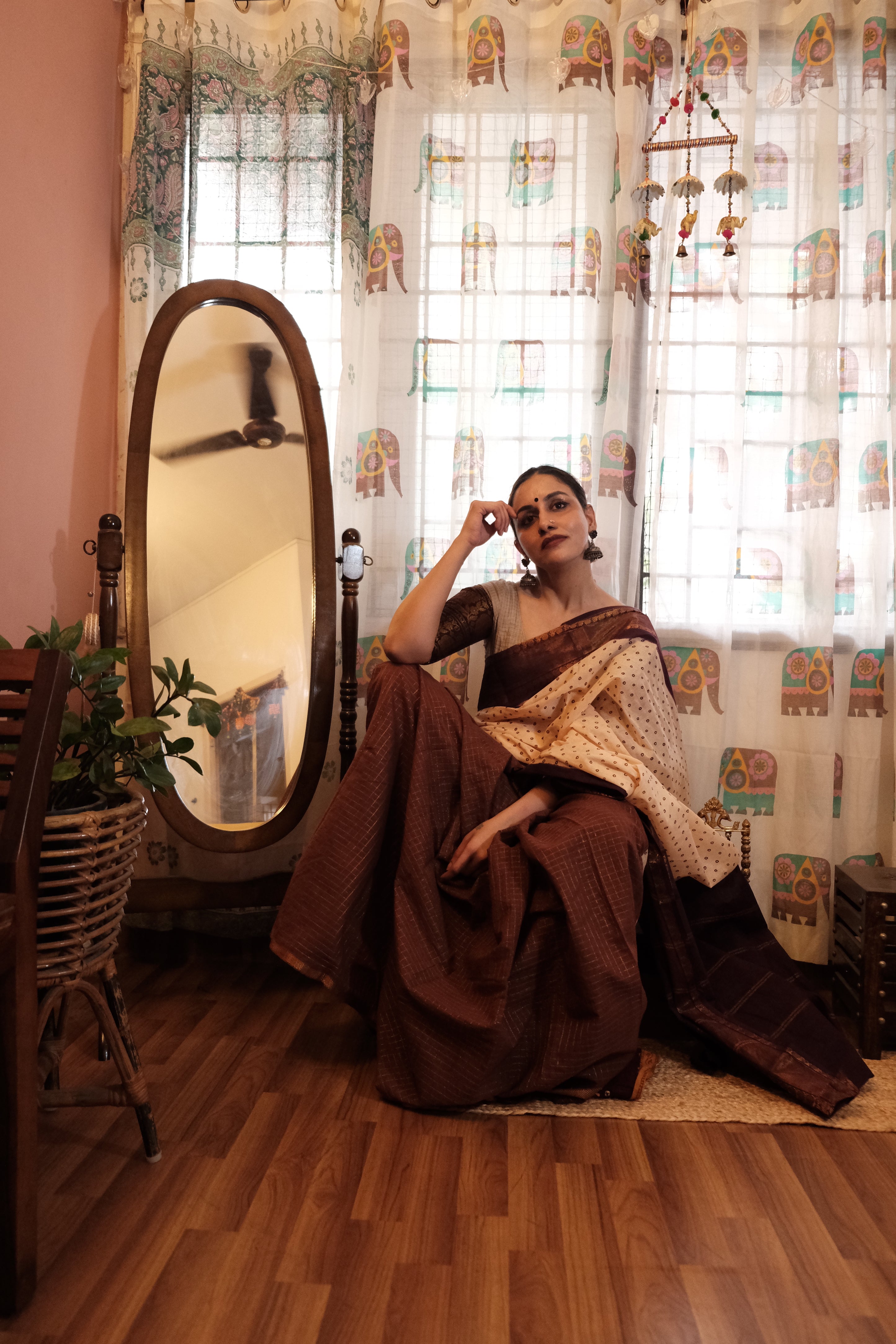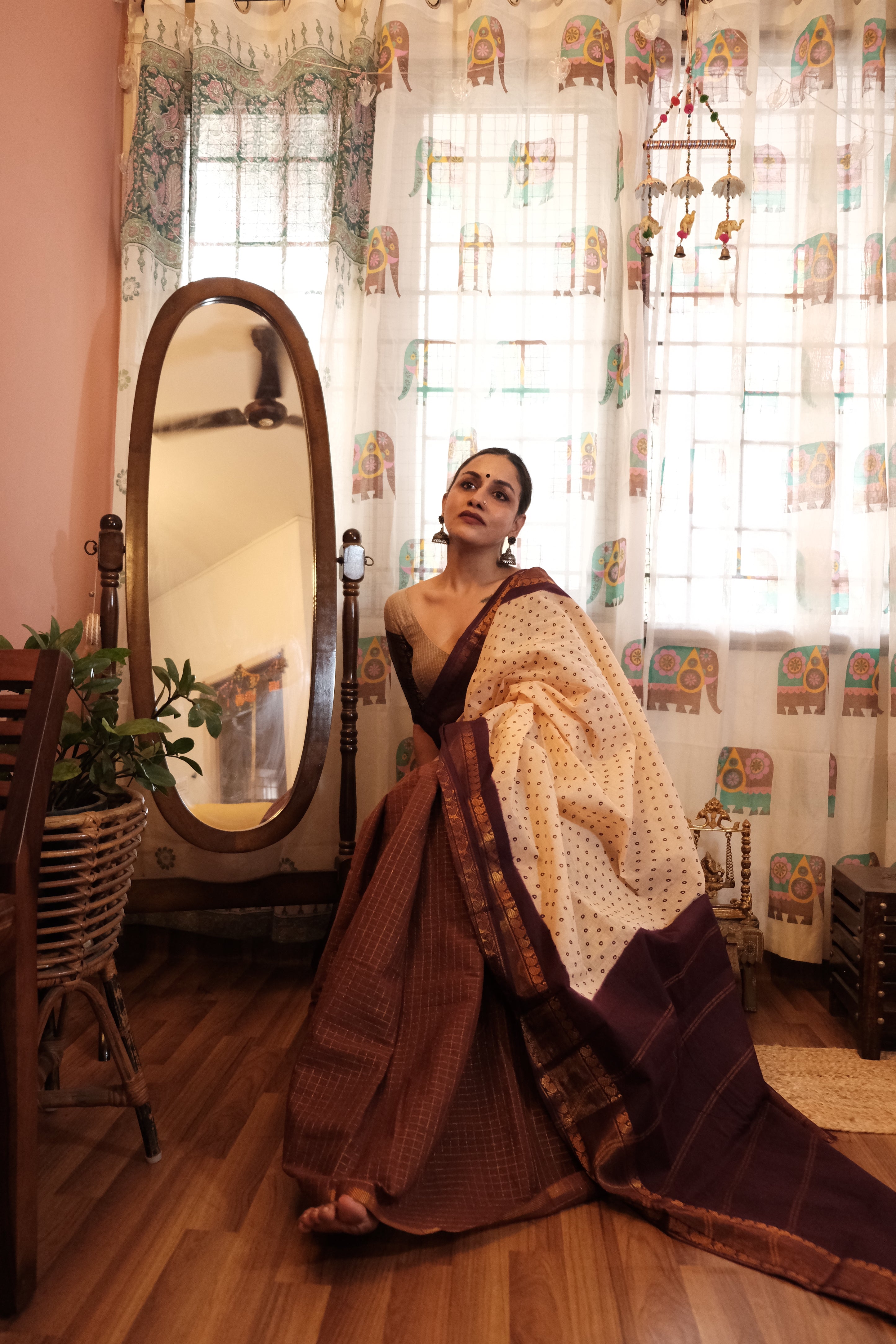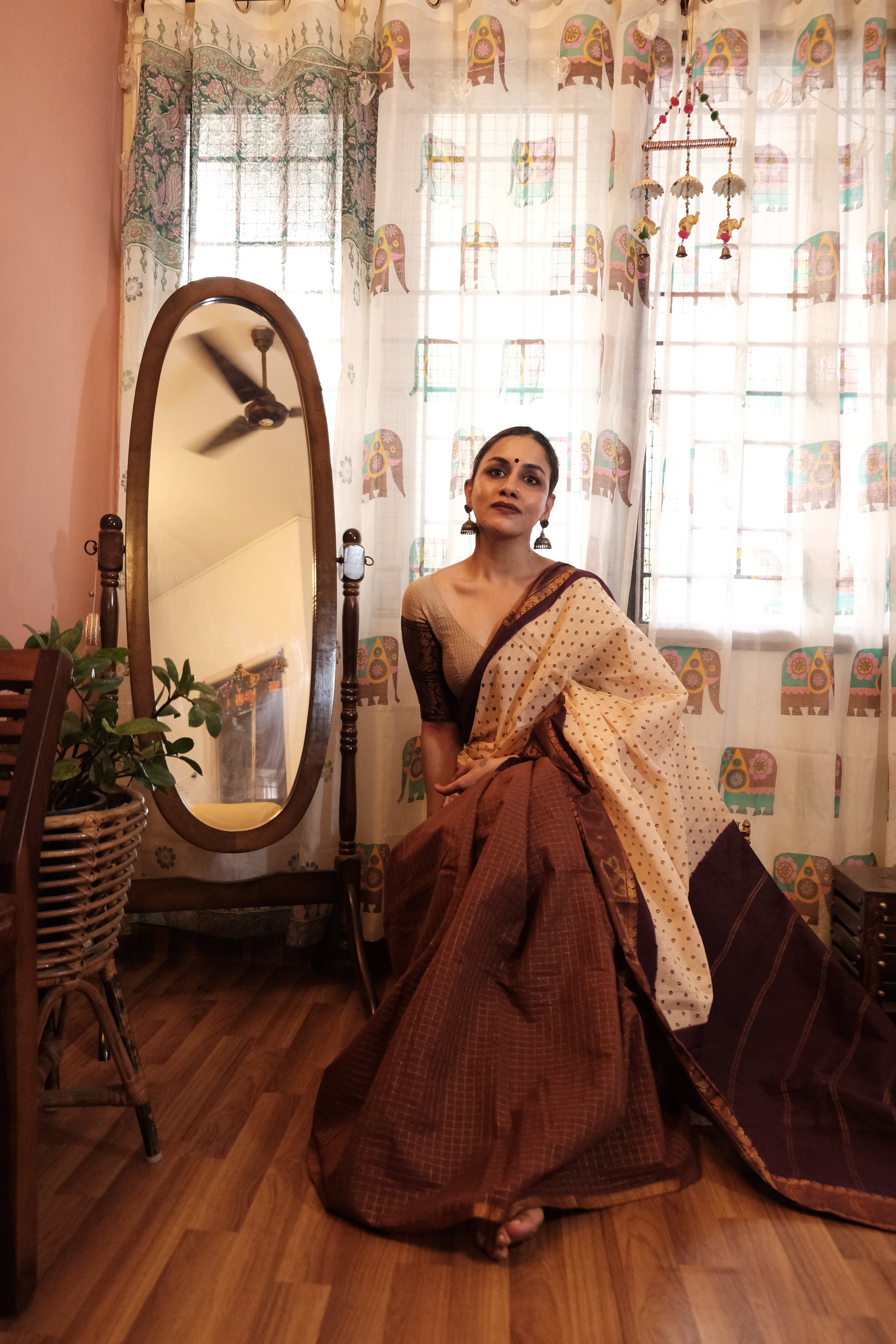 - Blushing Apricot Sungudi with Maroon Zari Pallu | Coffee Brown Podi Kattam Palu |
