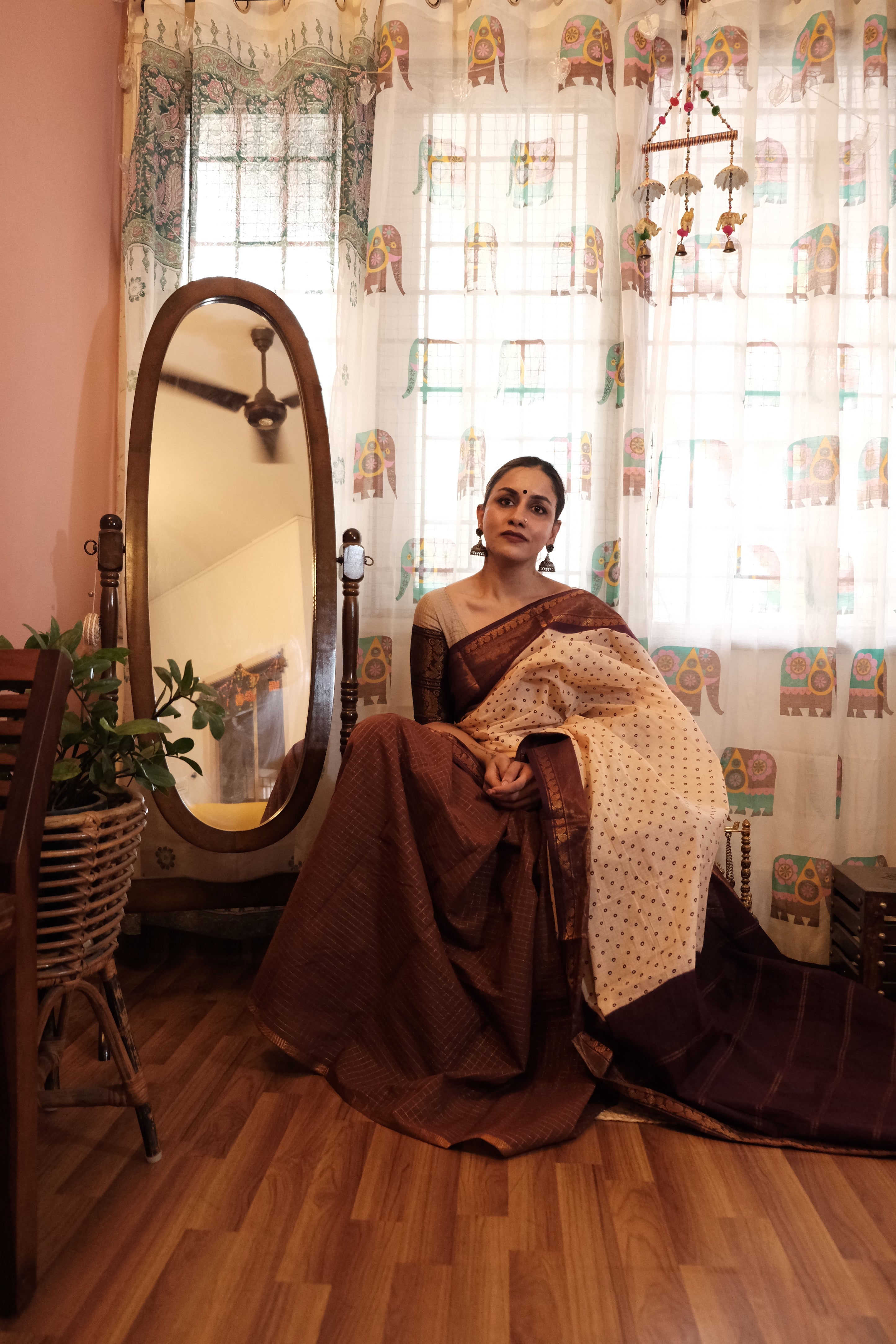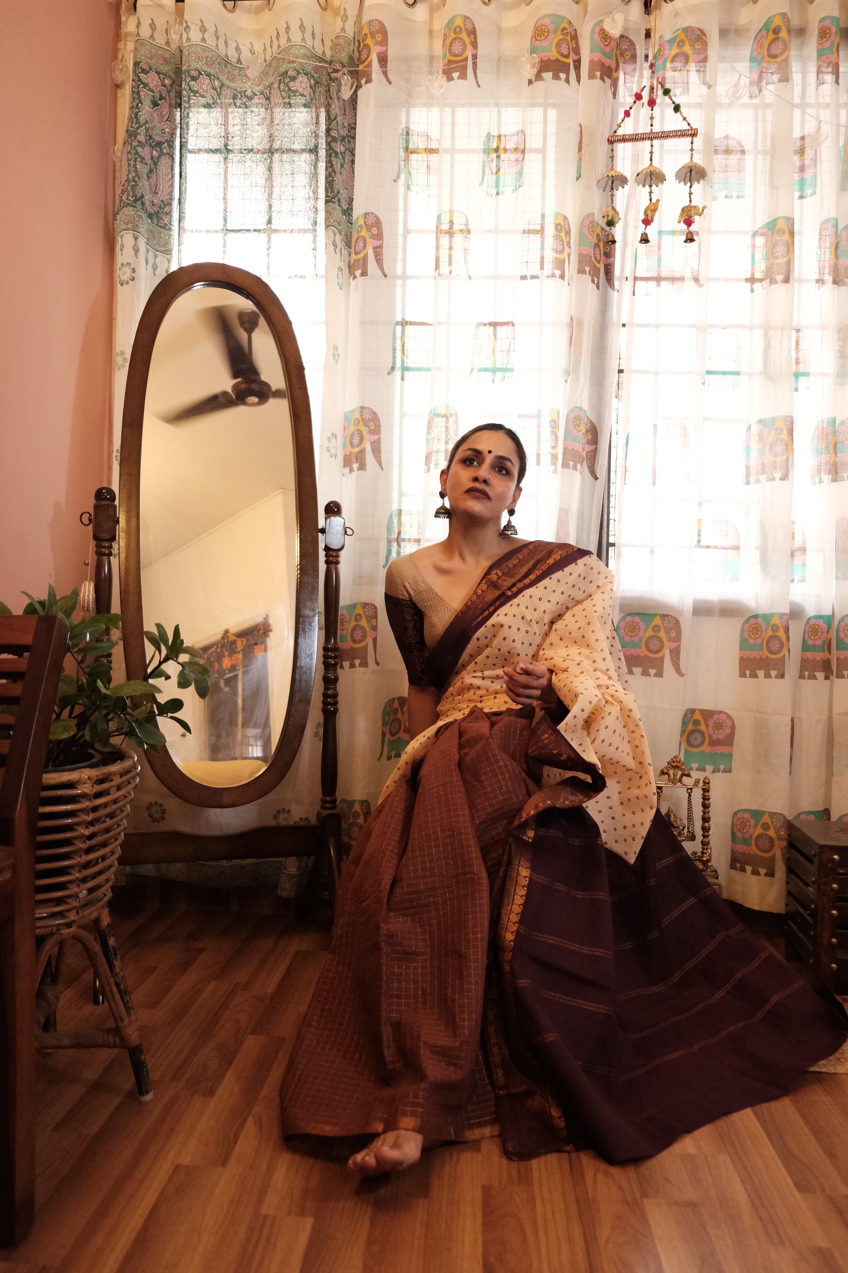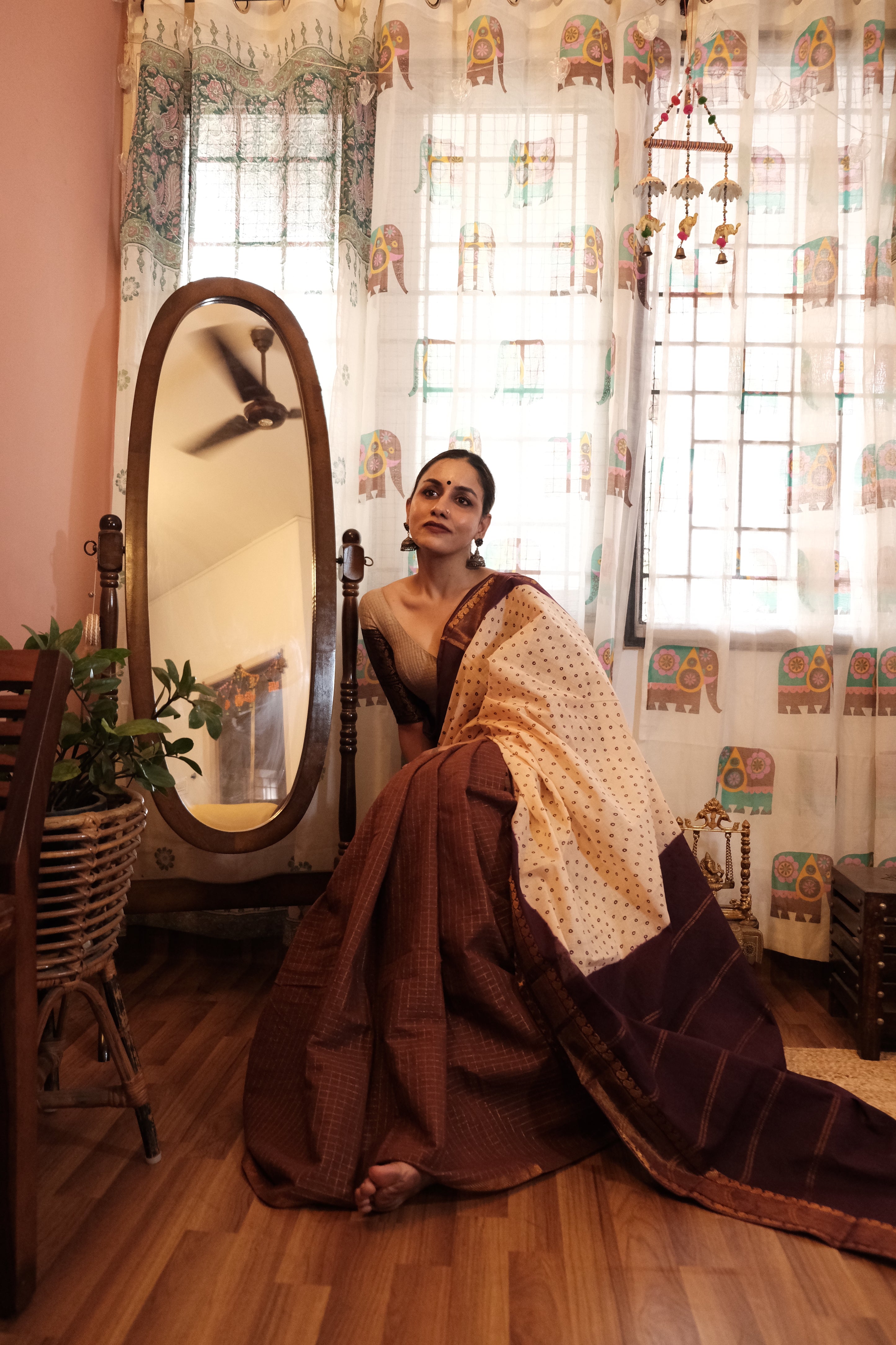 - Blushing Apricot Sungudi with Maroon Zari Pallu | Coffee Brown Podi Kattam Palu |