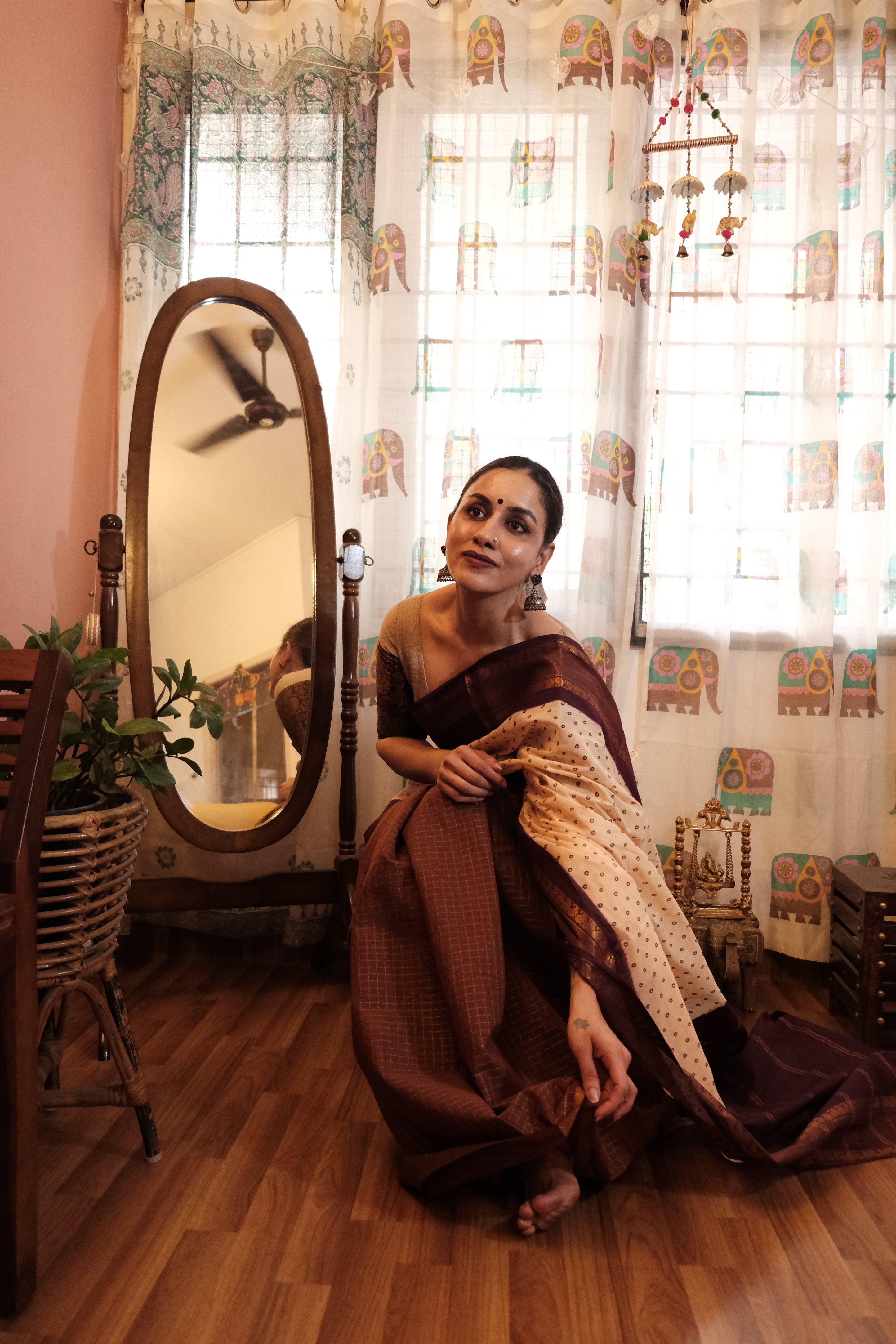 - Some Laya sarees are created by joining fabrics of different heights. In these pieces, the taller fabric has been folded to align with the shorter one. This fold remains tucked in at the waist when draped and does not affect the look or flow of the saree. The construction is intentional, allowing each fabric to retain its character while bringing the design together.