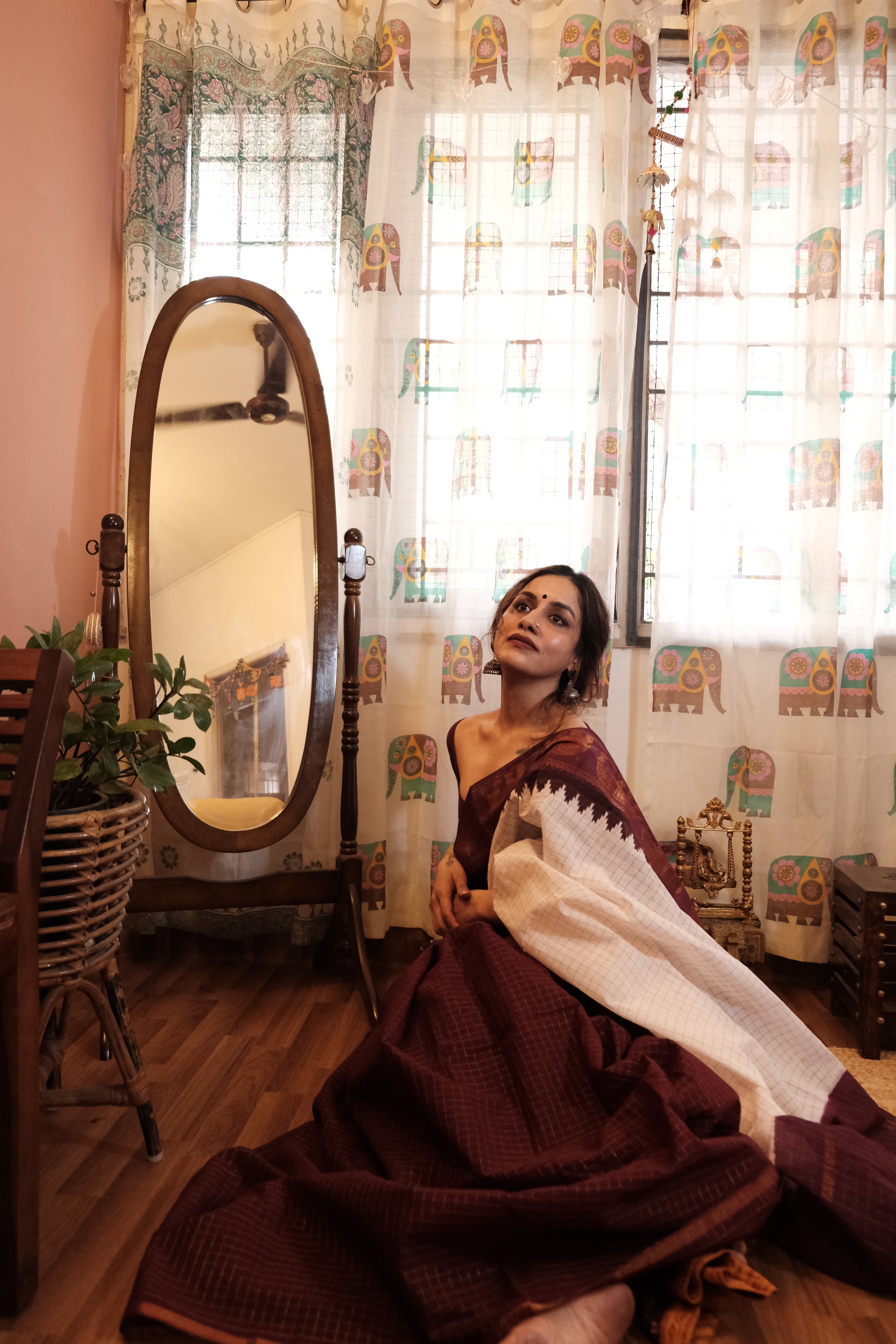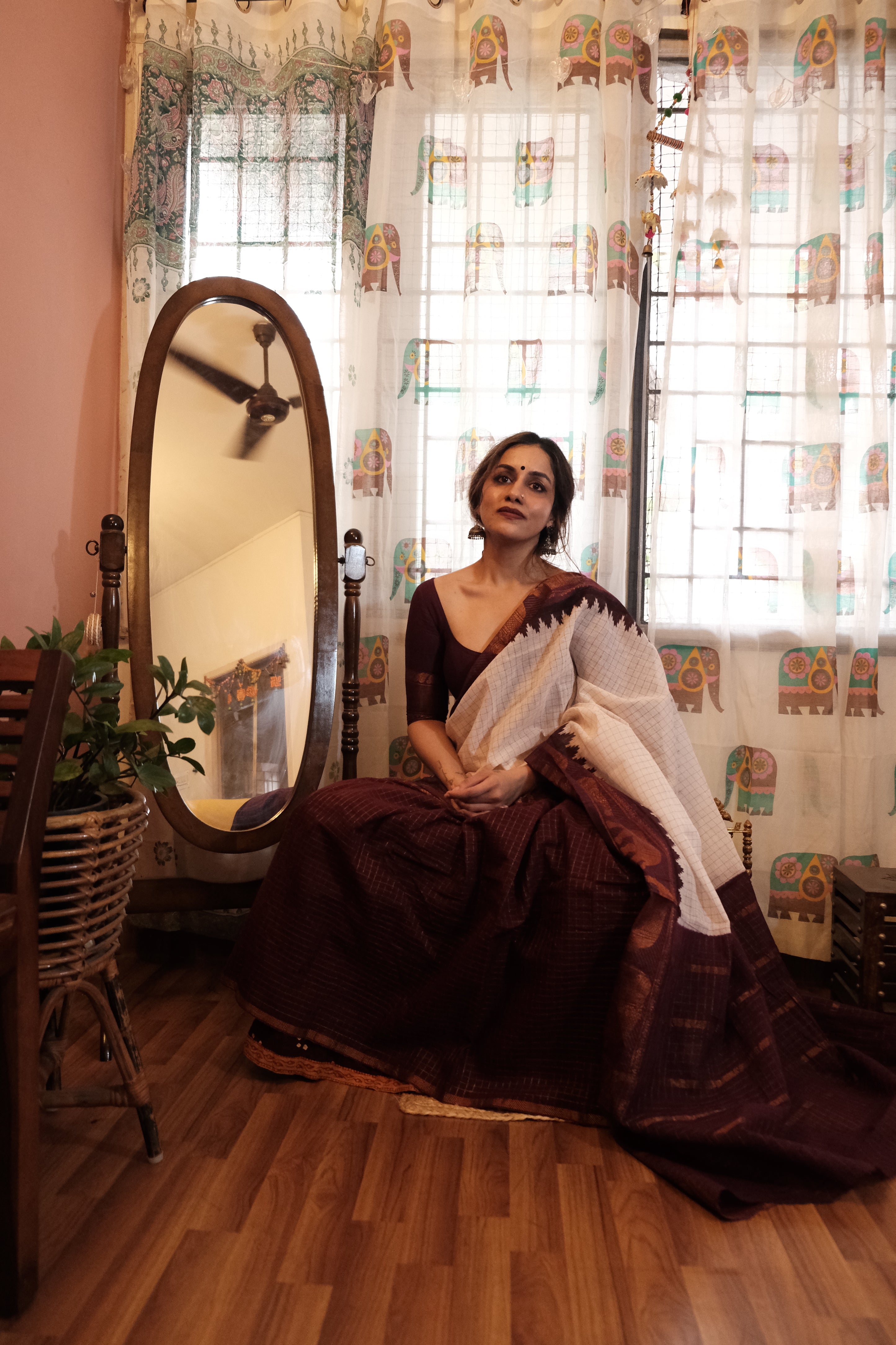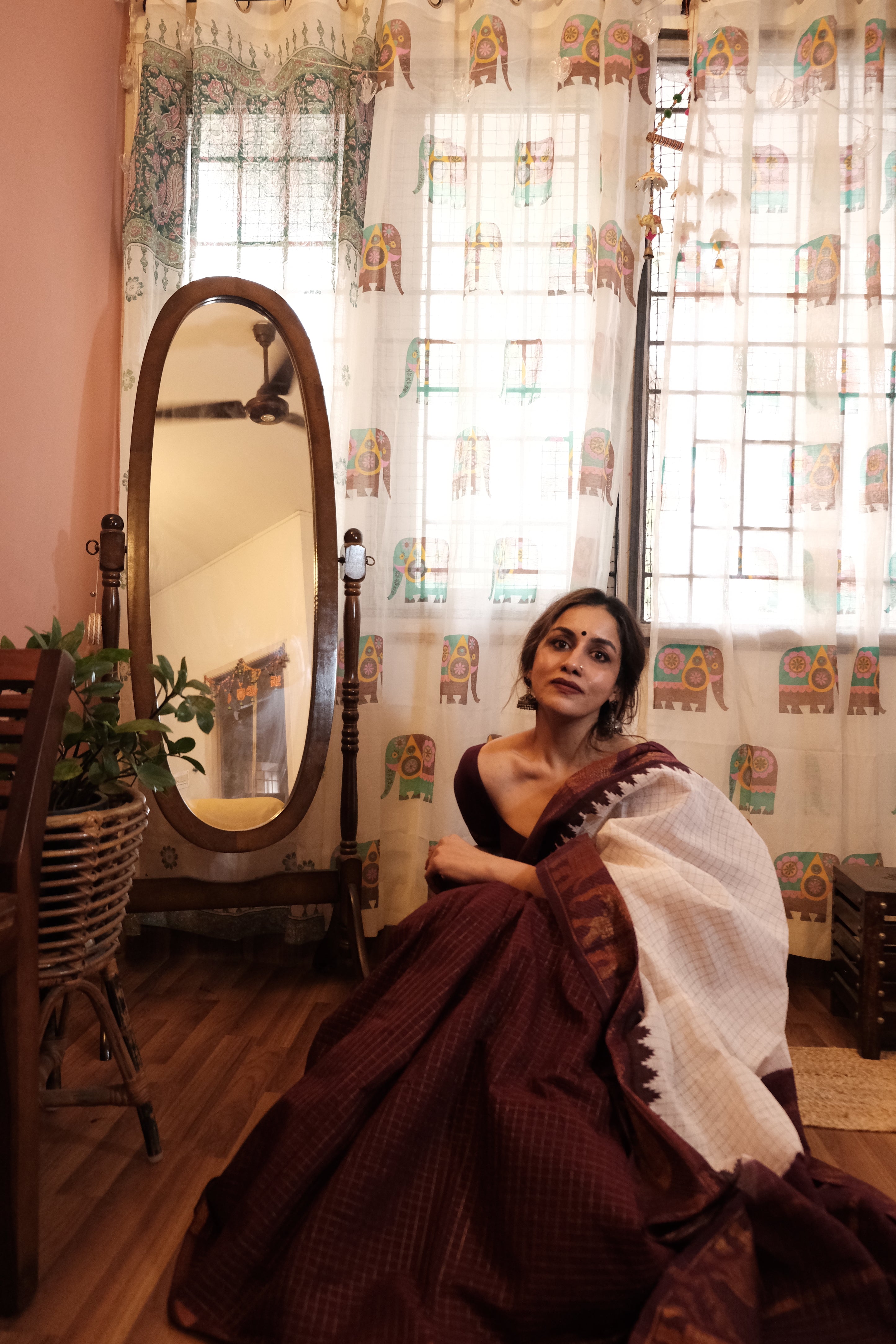 - White Kattam with Zari Pallu | Maroon Podi Kattam Pallu