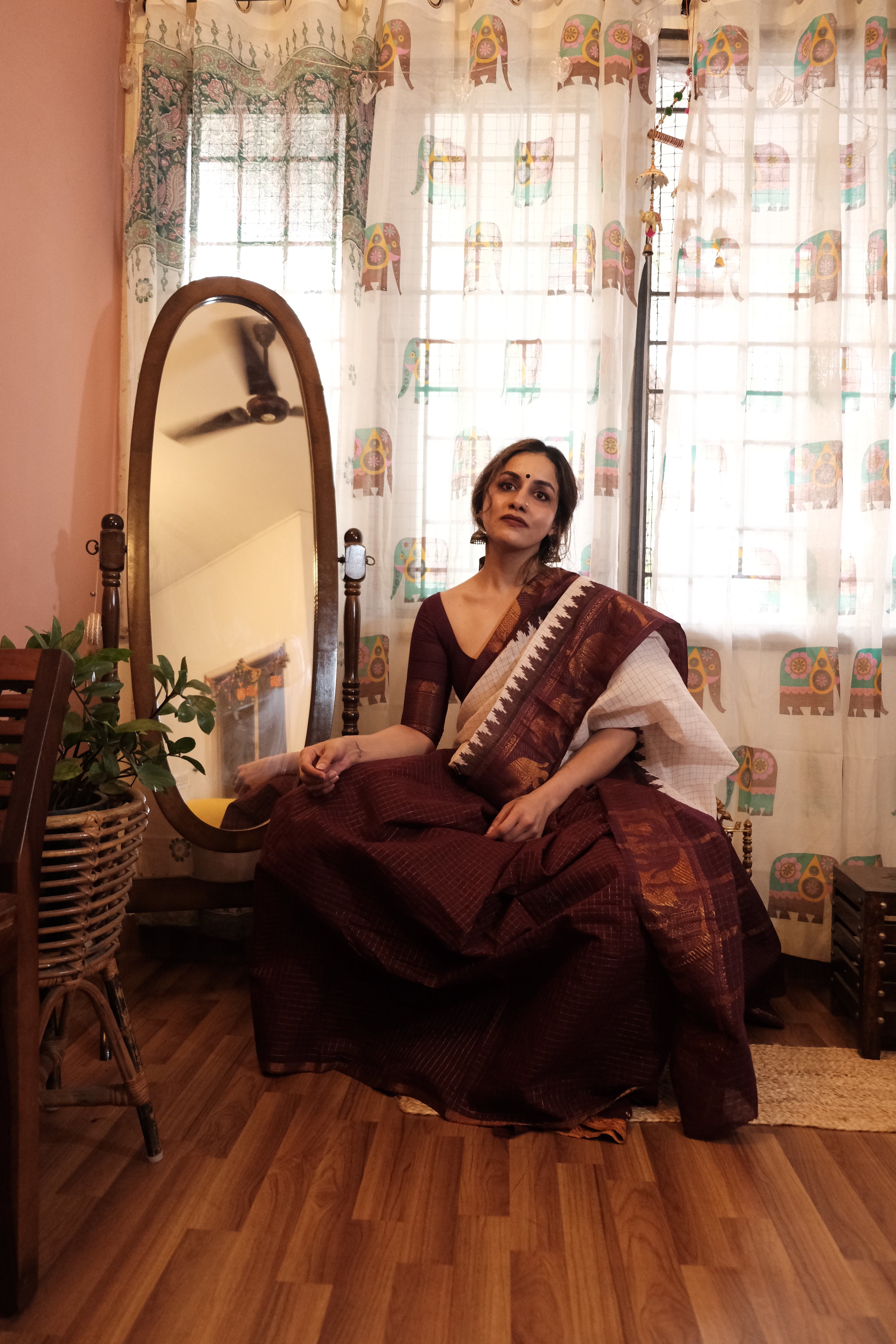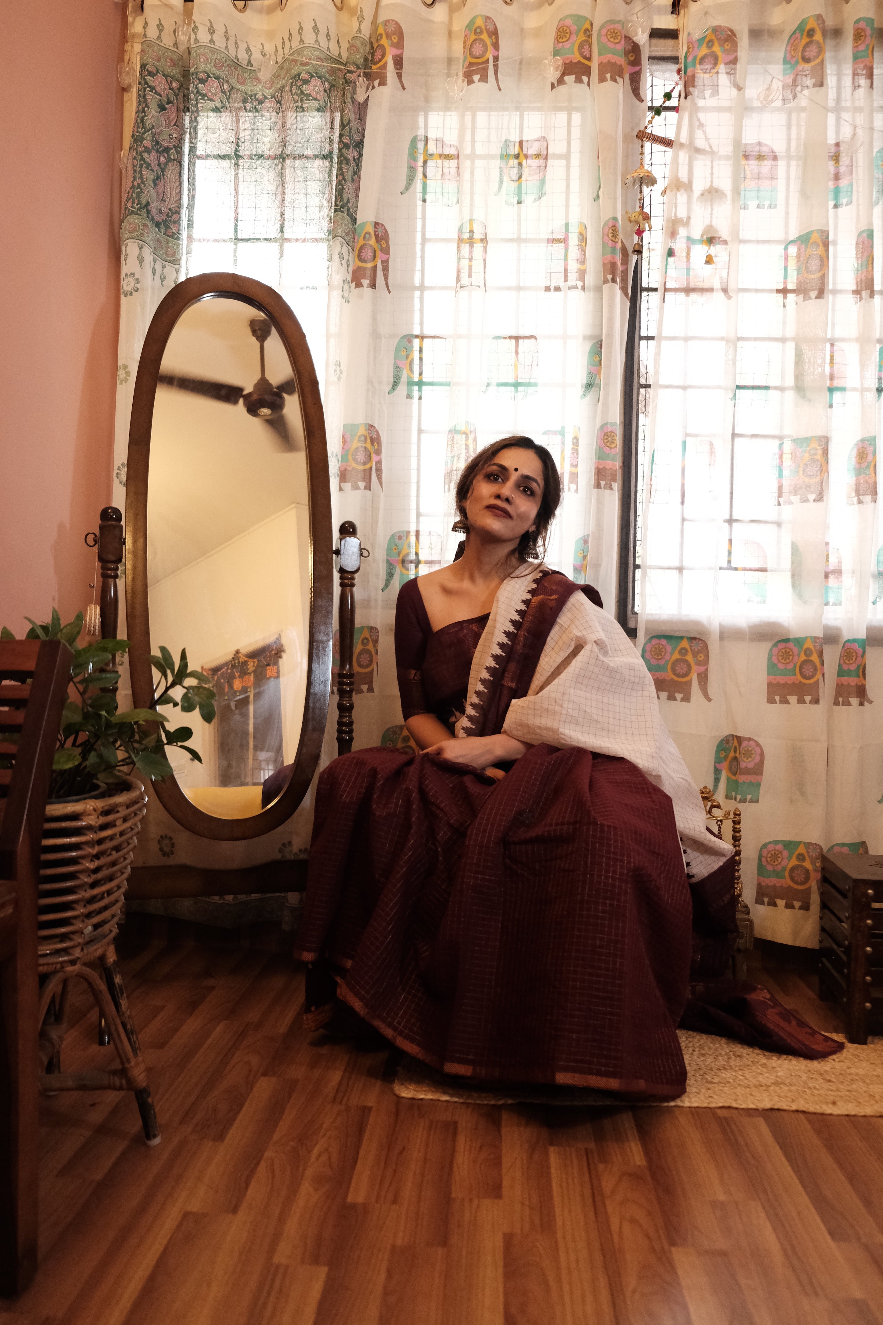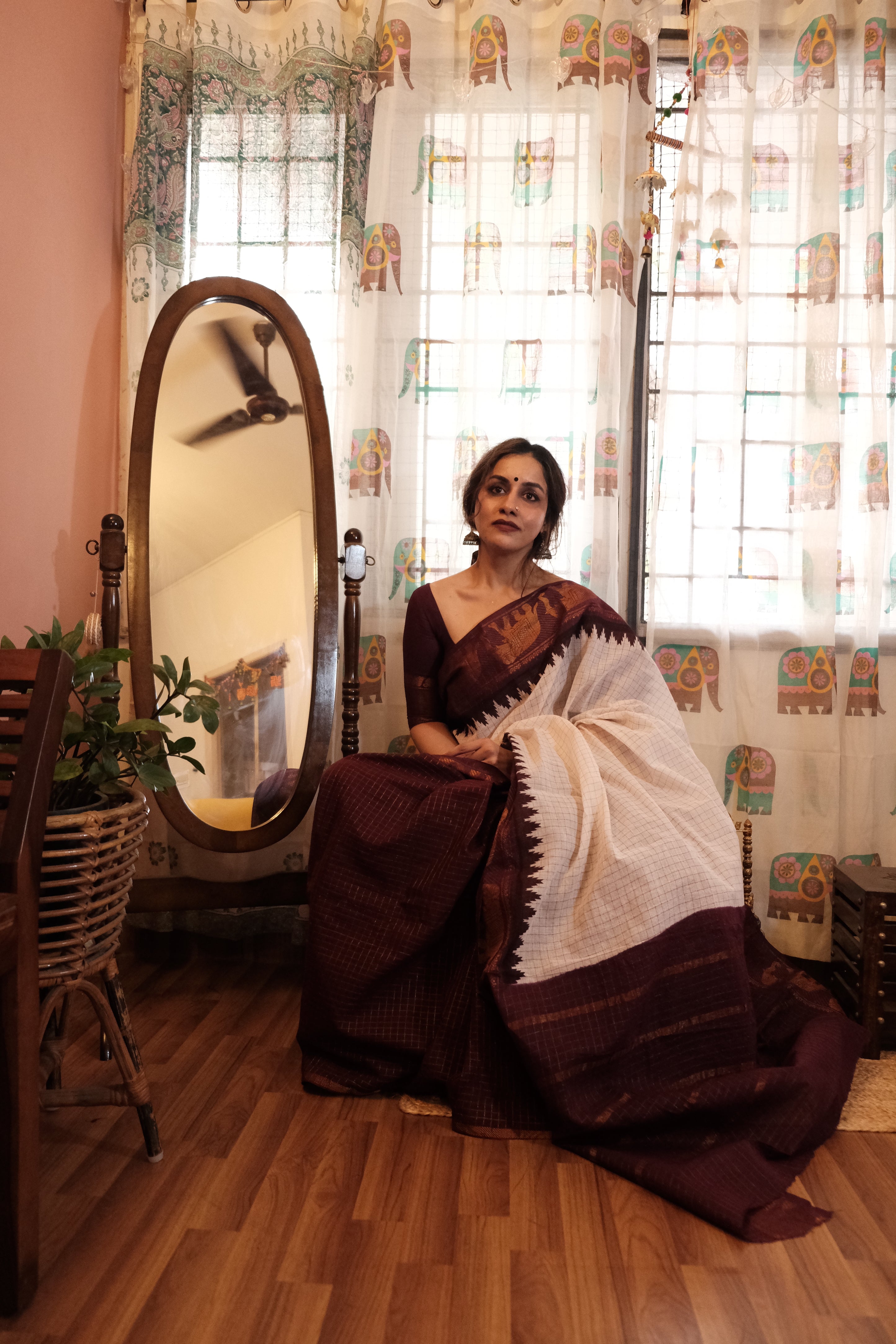 - White Kattam with Zari Pallu | Maroon Podi Kattam Pallu