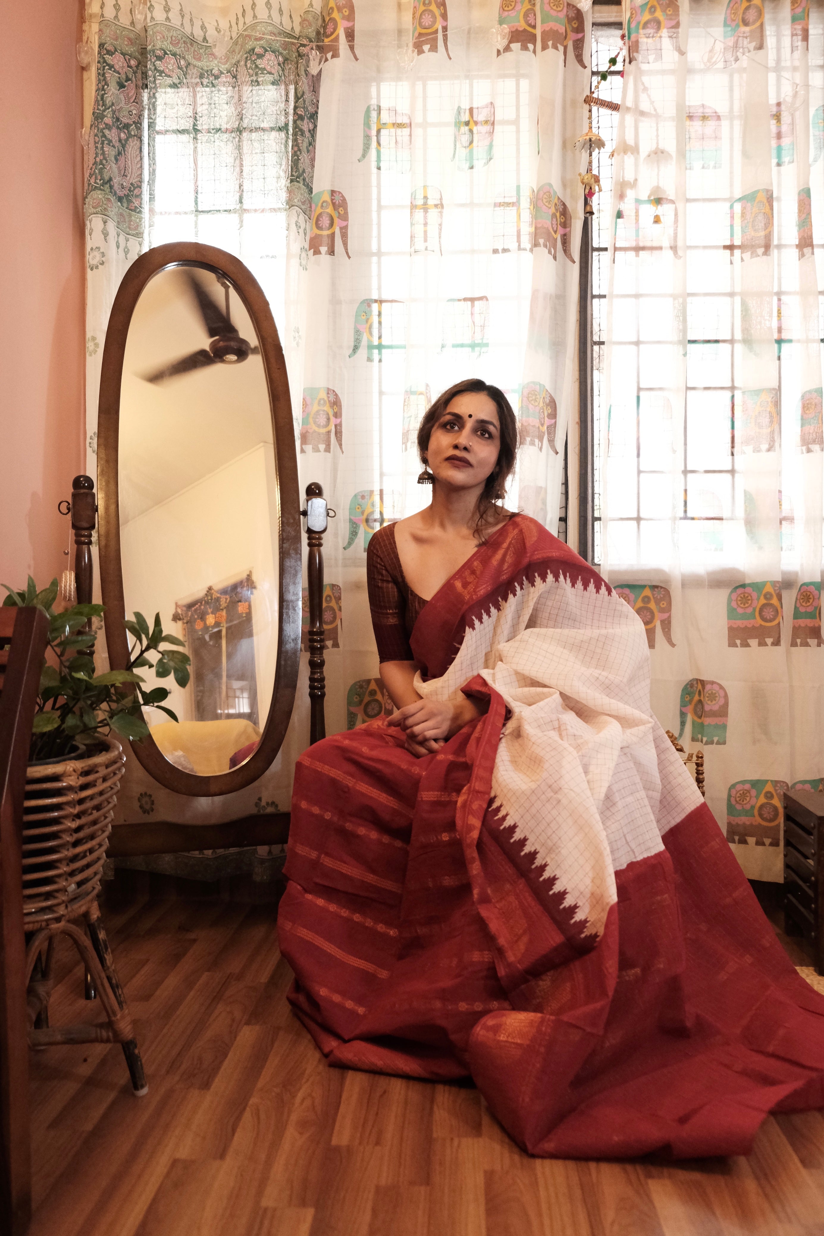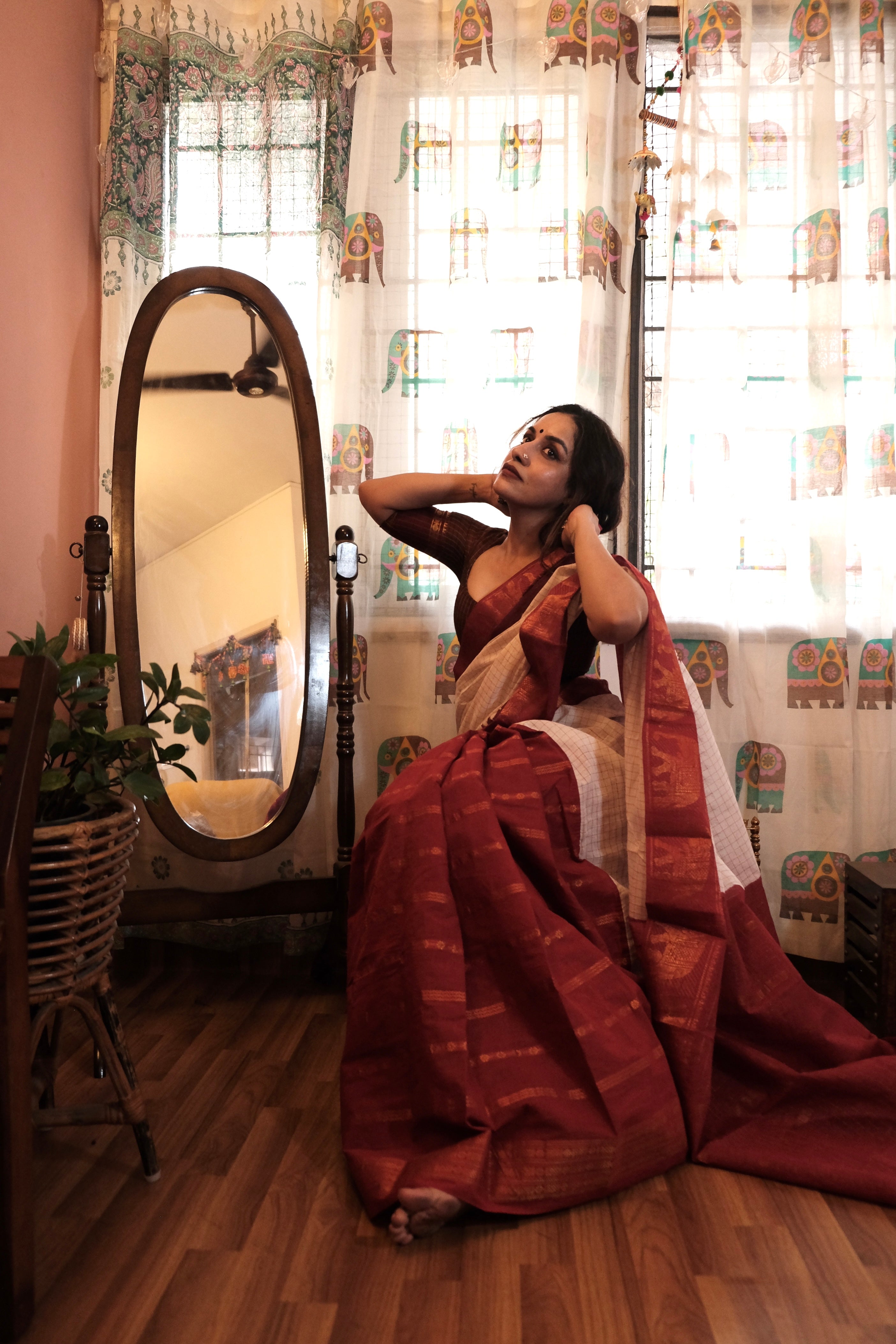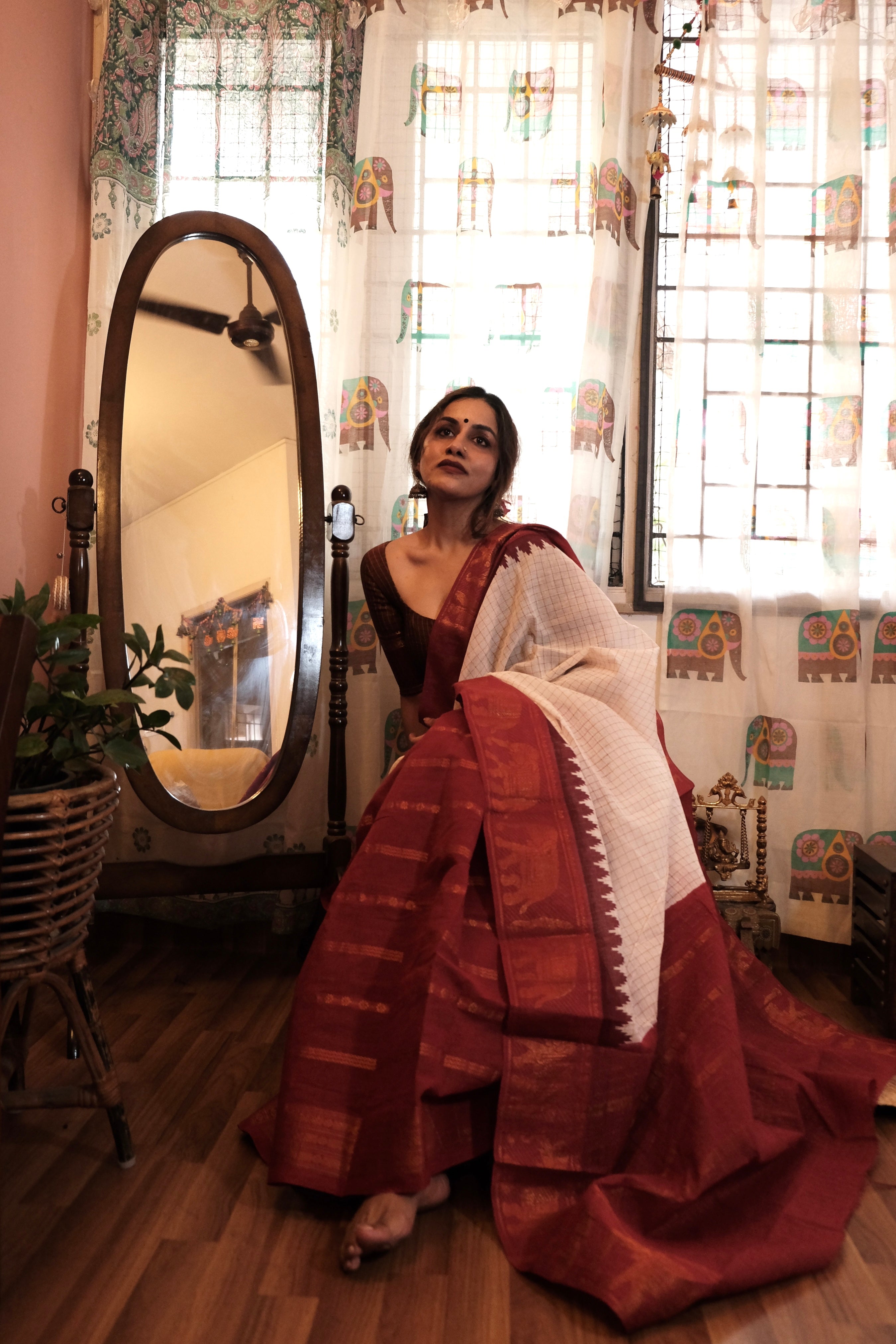 - White Kattam with Red Zari Pallu | Red Velthari Body
