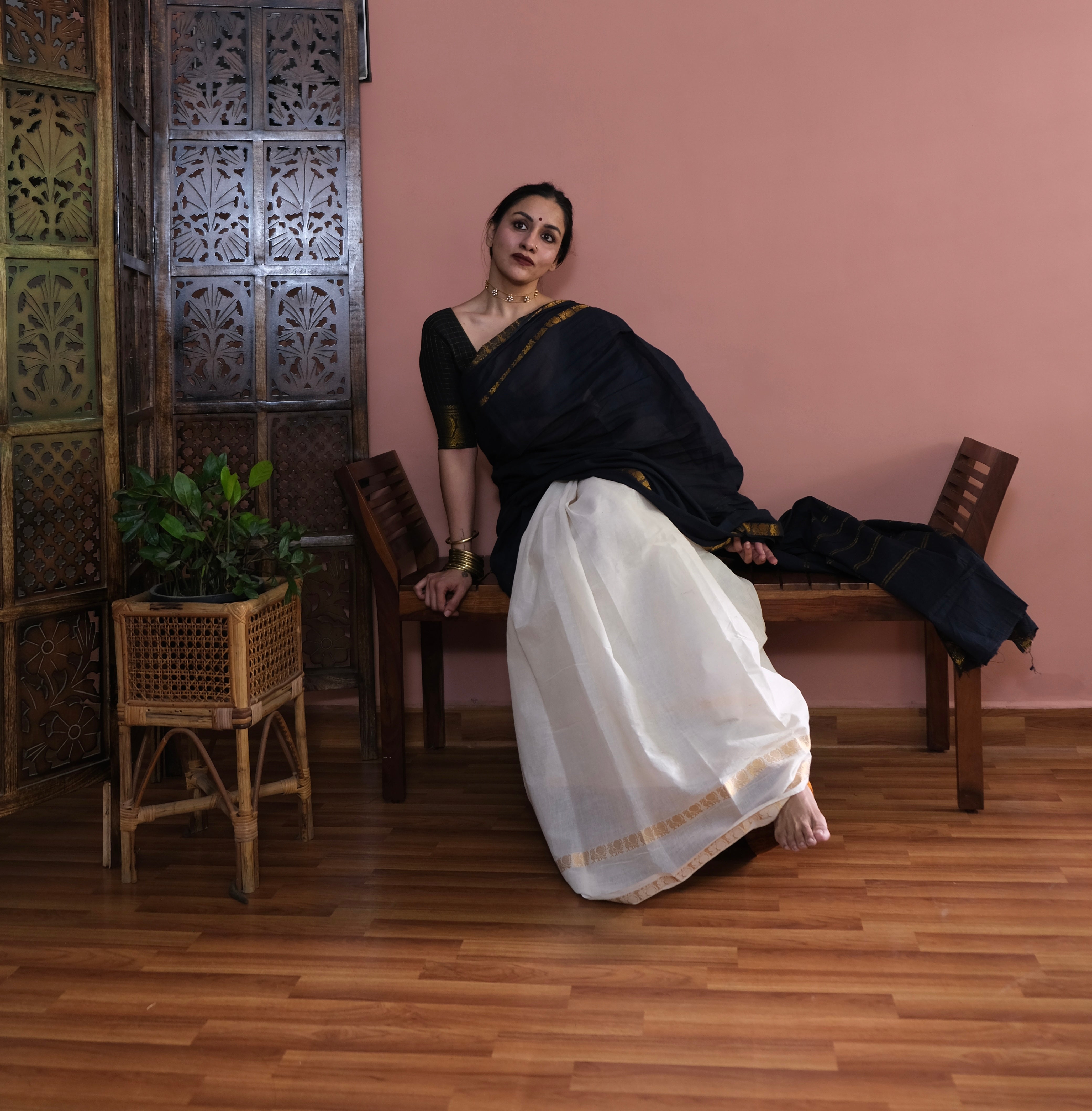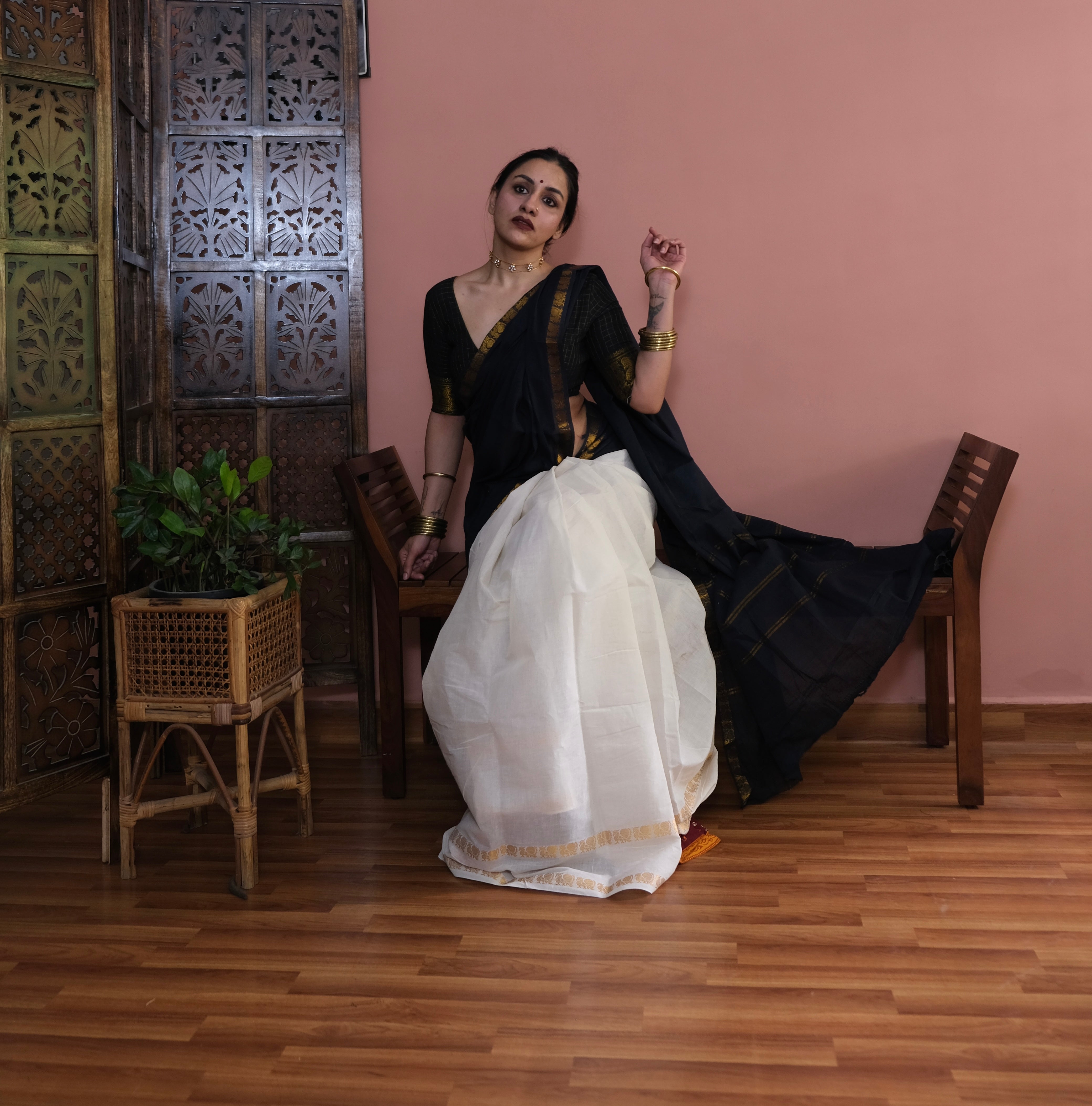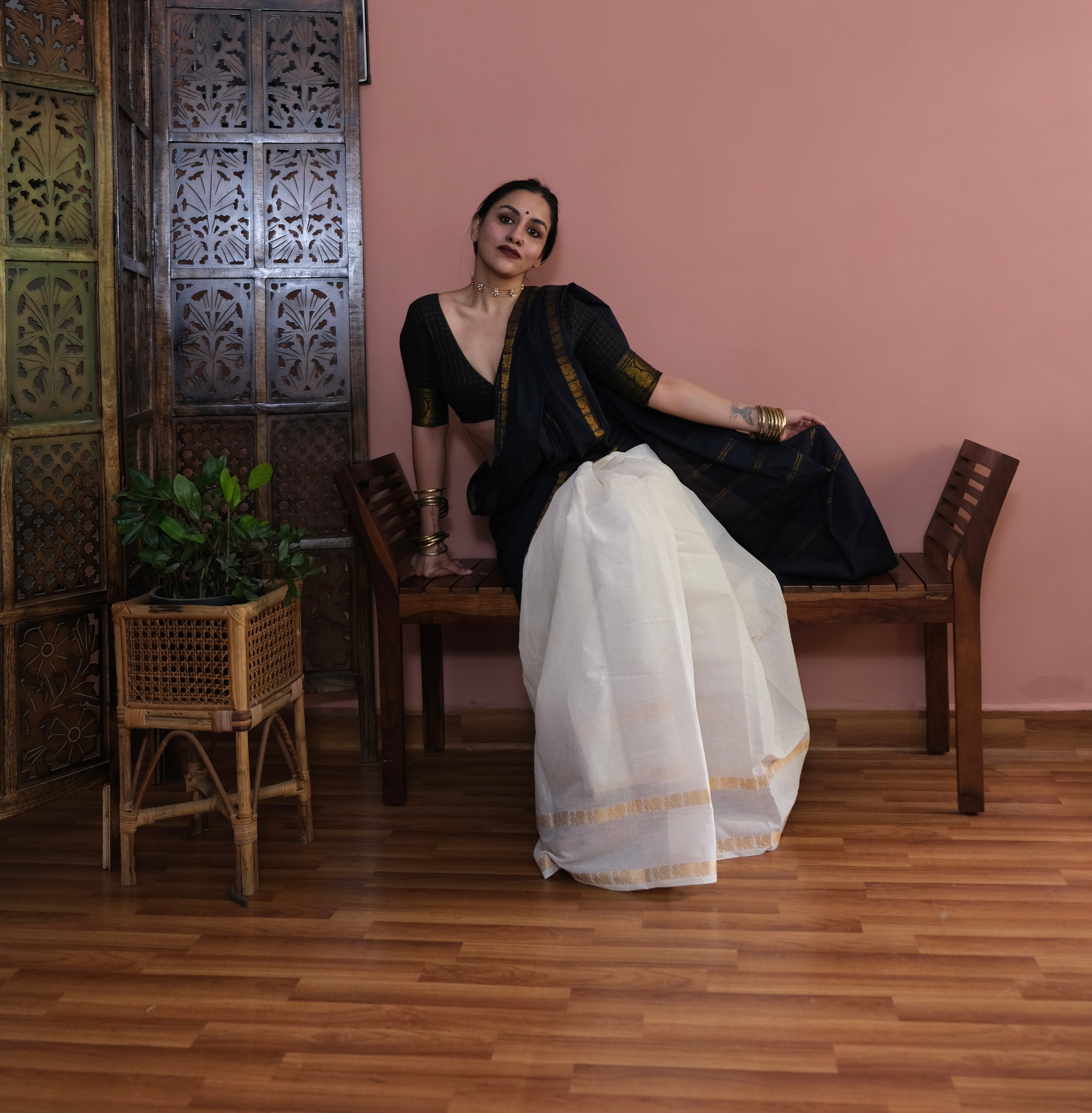 - Black Plain Body | Off-white Checkered Pallu