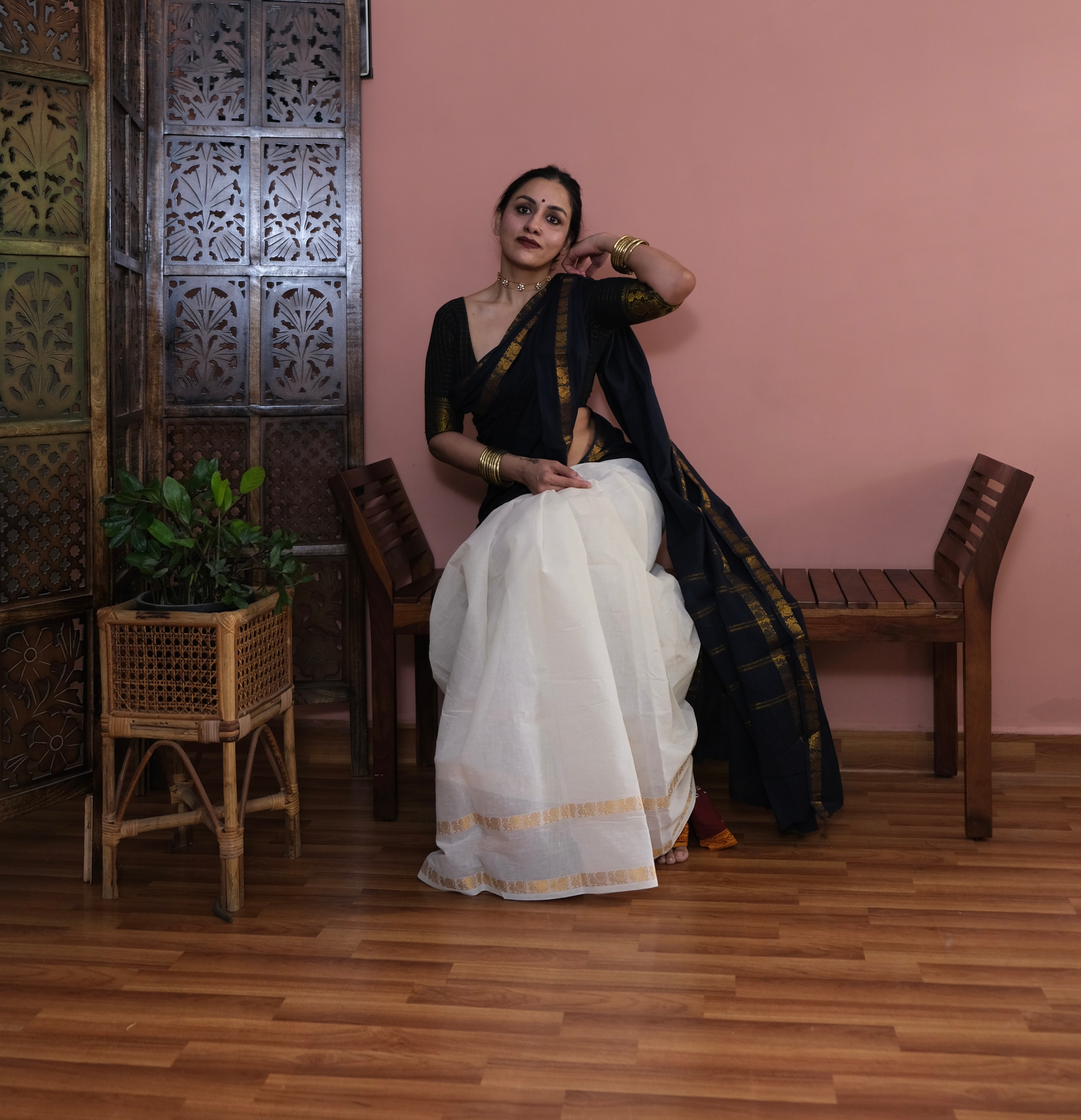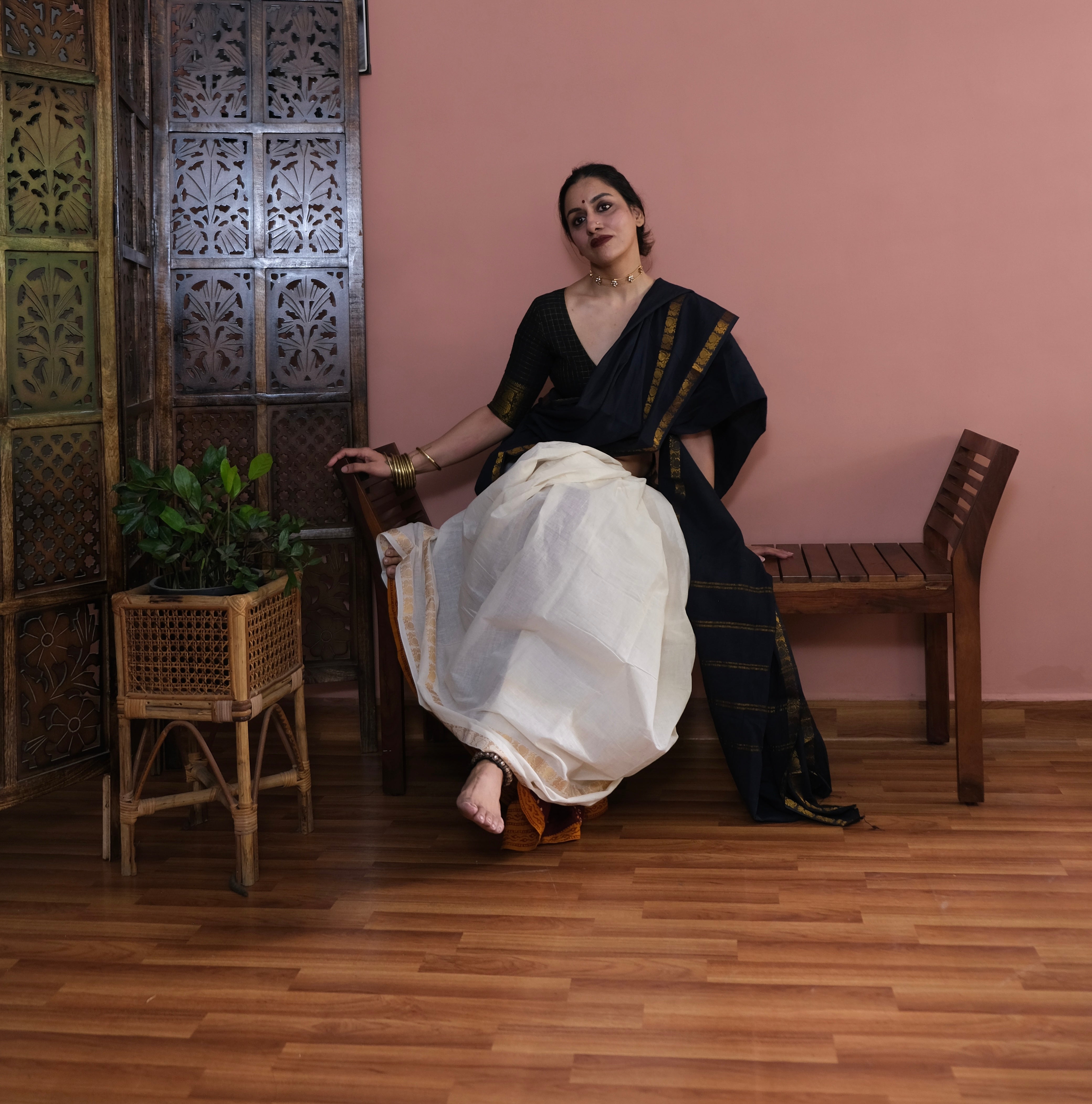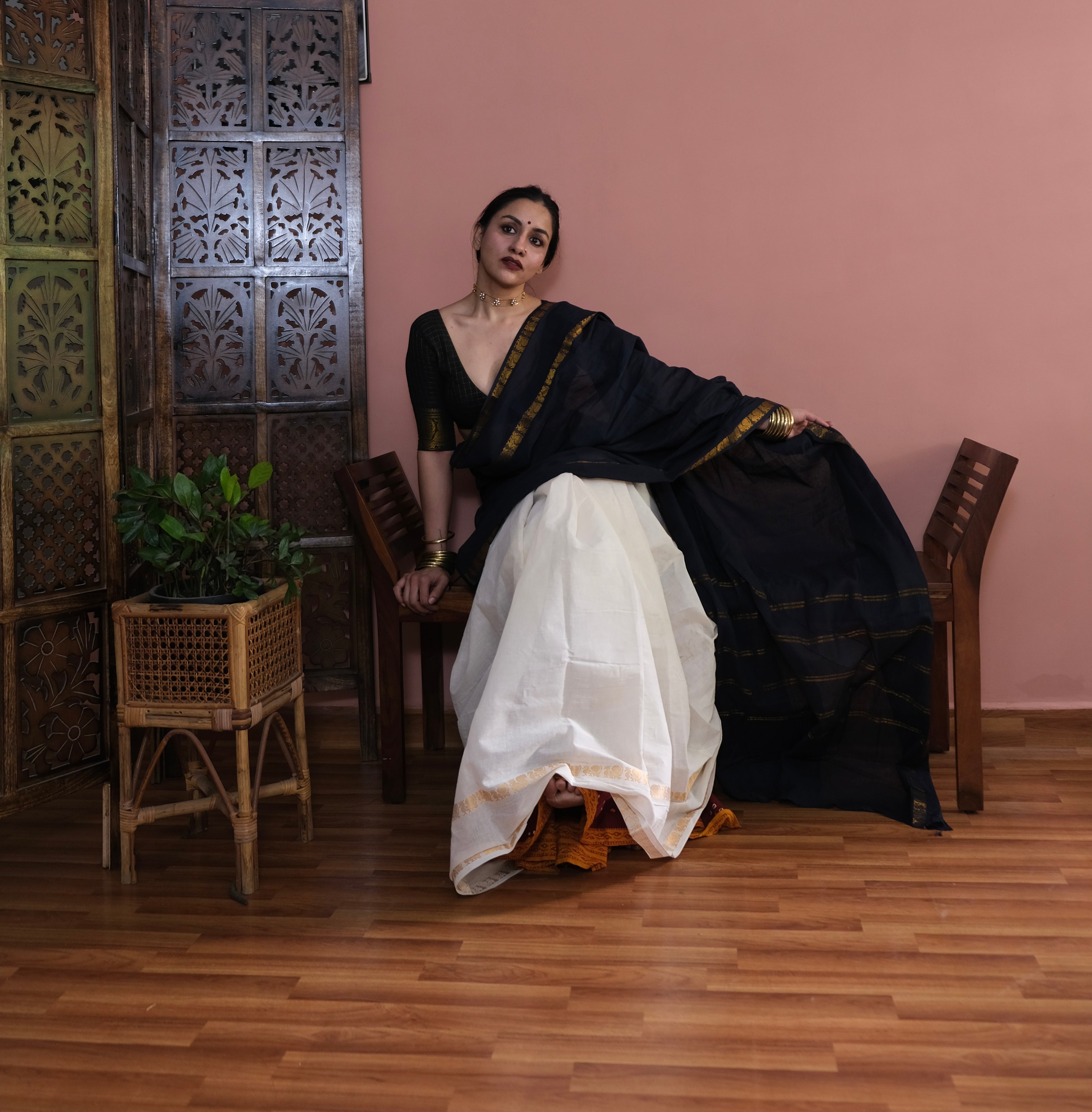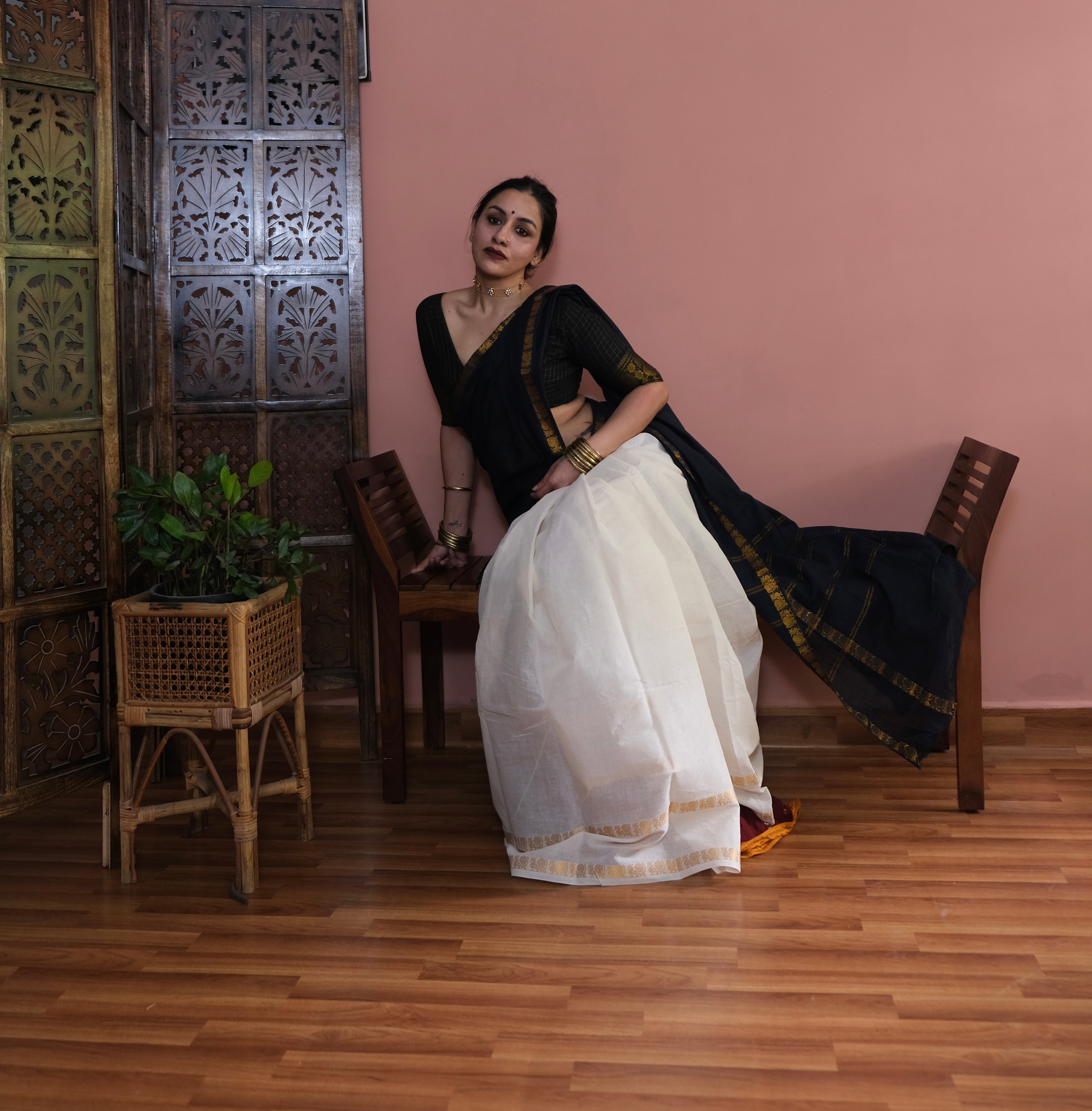 - Black Plain Body | Off-white Checkered Pallu