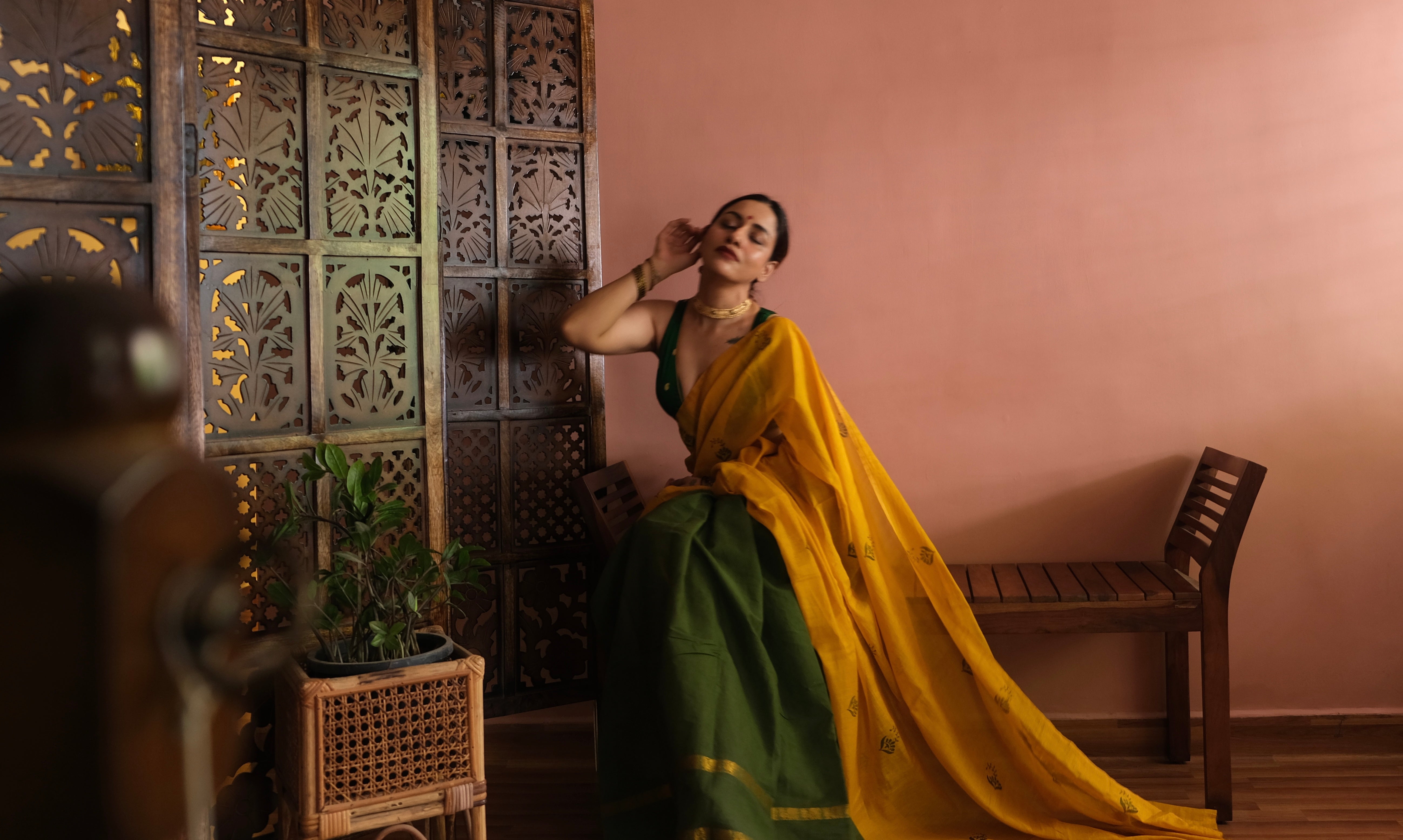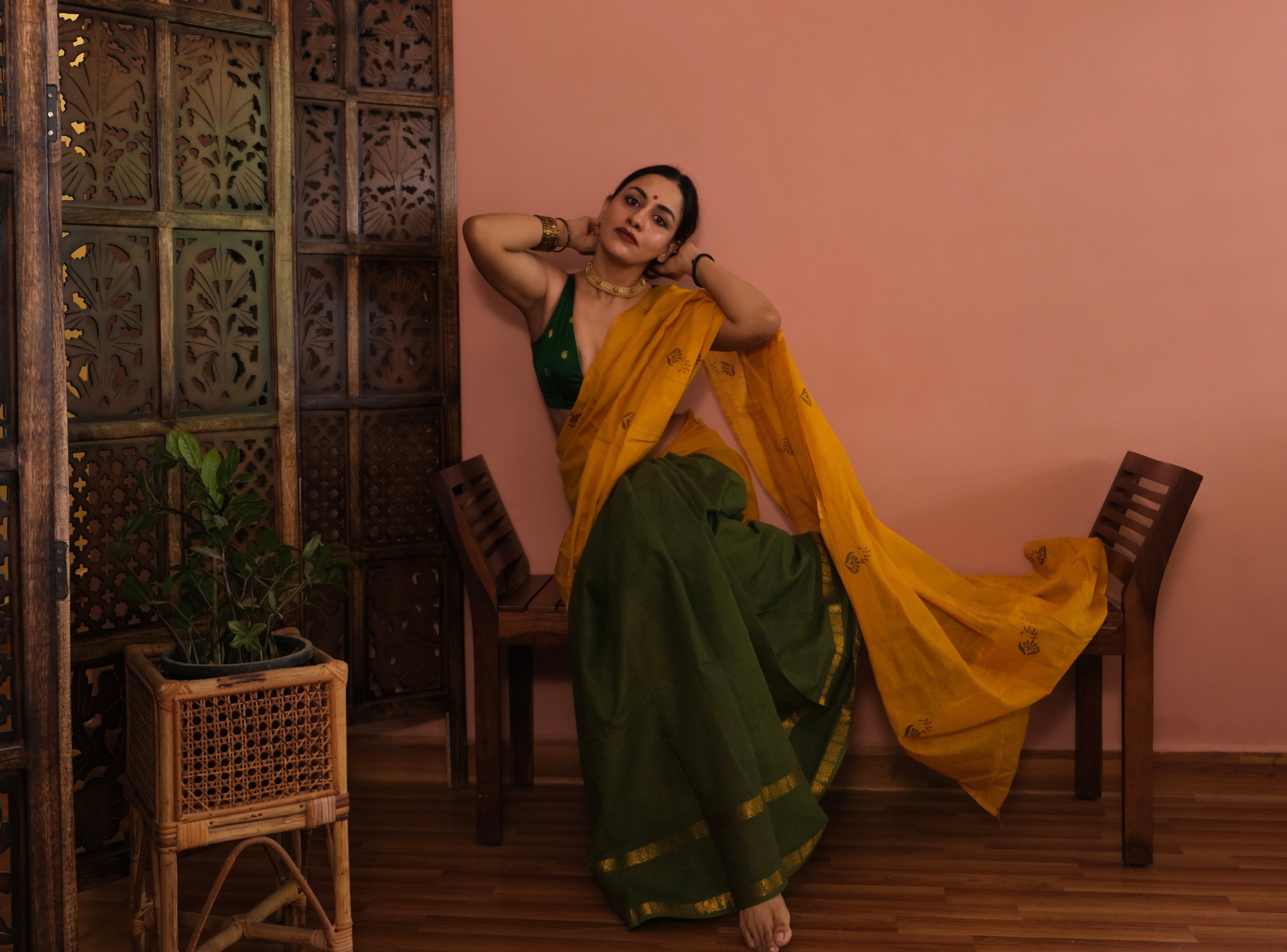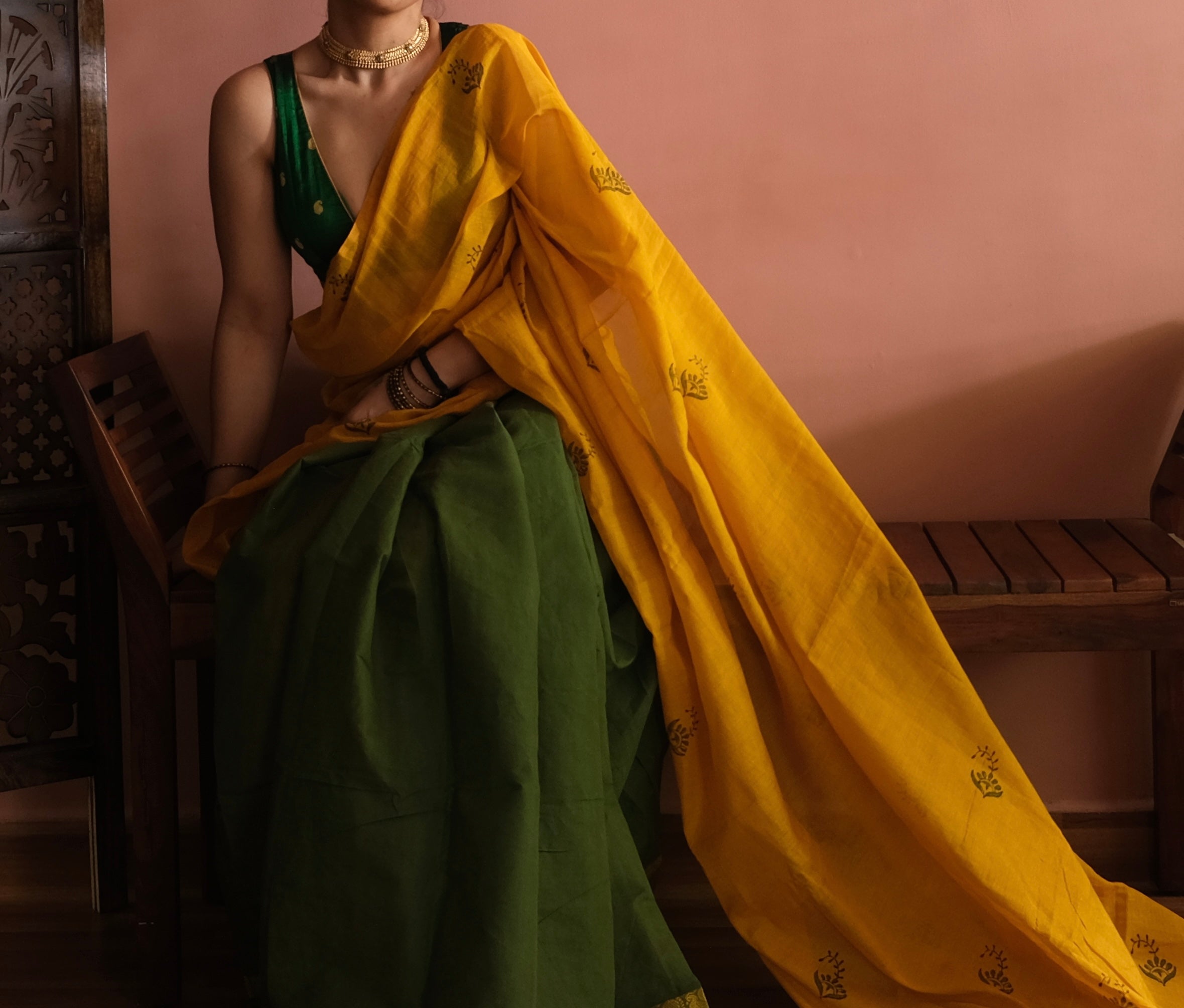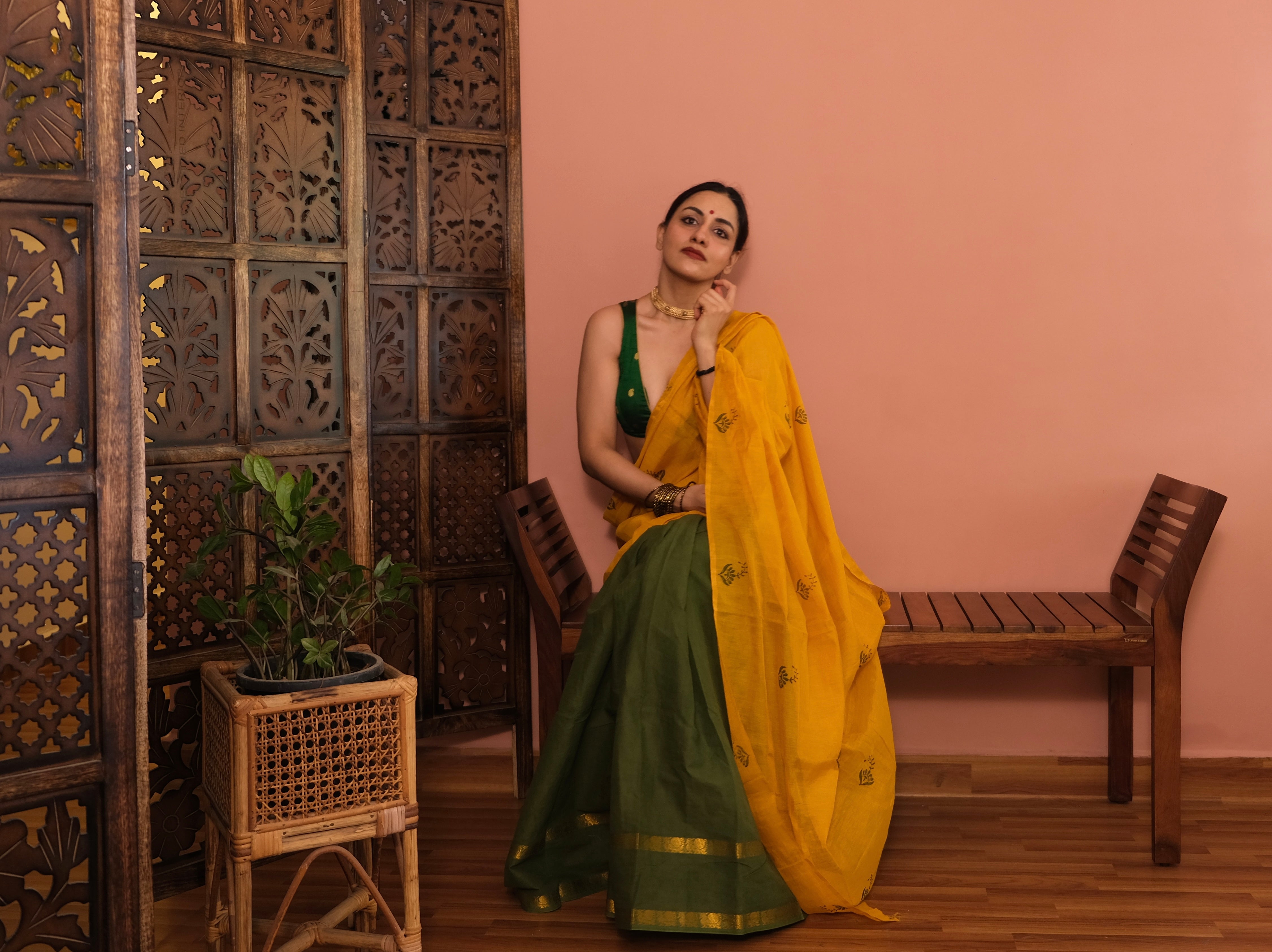 - Some Laya sarees are created by joining fabrics of different heights. In these pieces, the taller fabric has been folded to align with the shorter one. This fold remains tucked in at the waist when draped and does not affect the look or flow of the saree. The construction is intentional, allowing each fabric to retain its character while bringing the design together.
