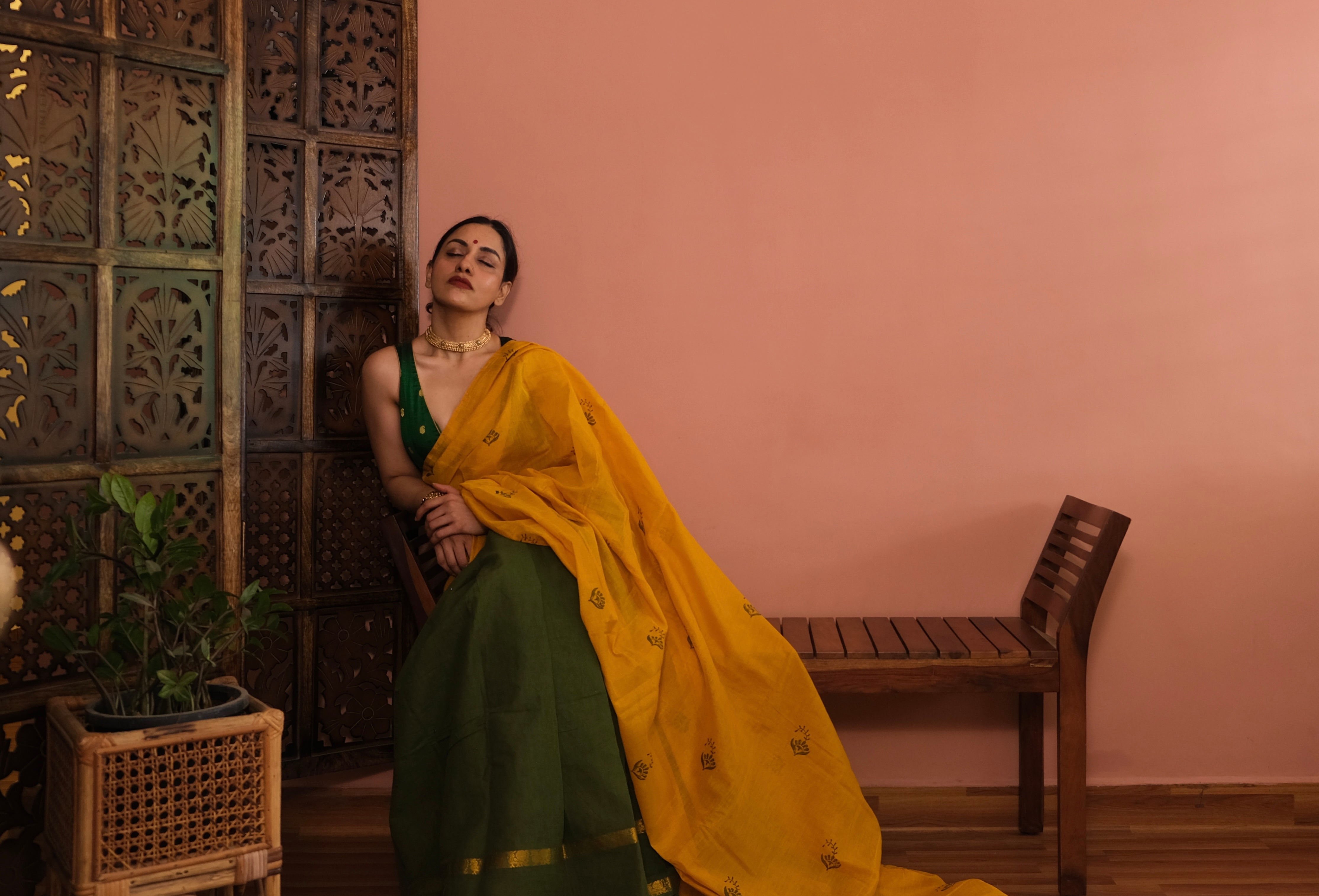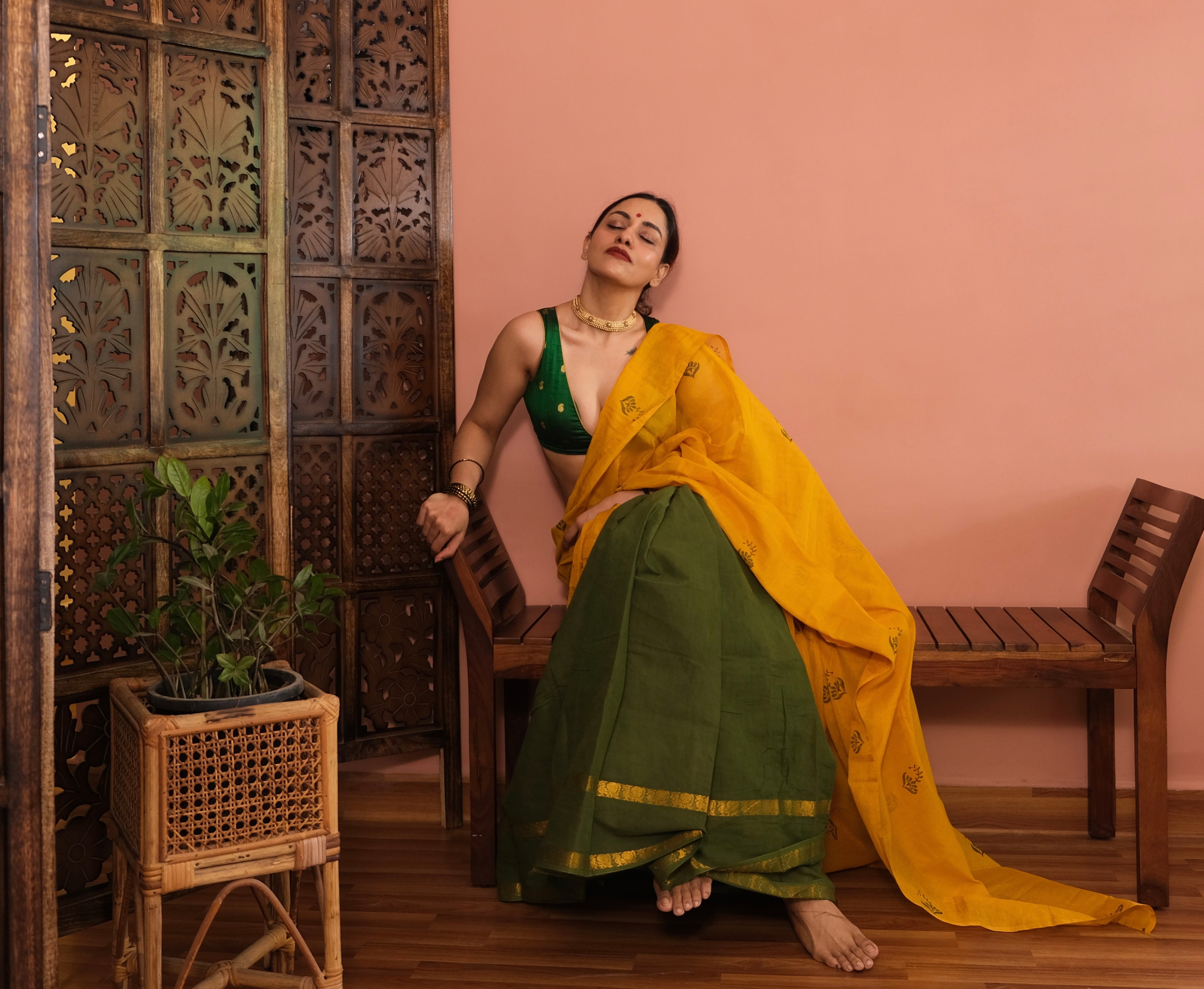 - Certain Laya sarees are crafted by joining fabrics of slightly different heights. For example, tissue pallus may measure 42.5 inches while the pleats and body measure 45 inches. This variation is part of the design and construction of Laya, highlighting the individuality of each fabric and the experimental spirit of the edit.