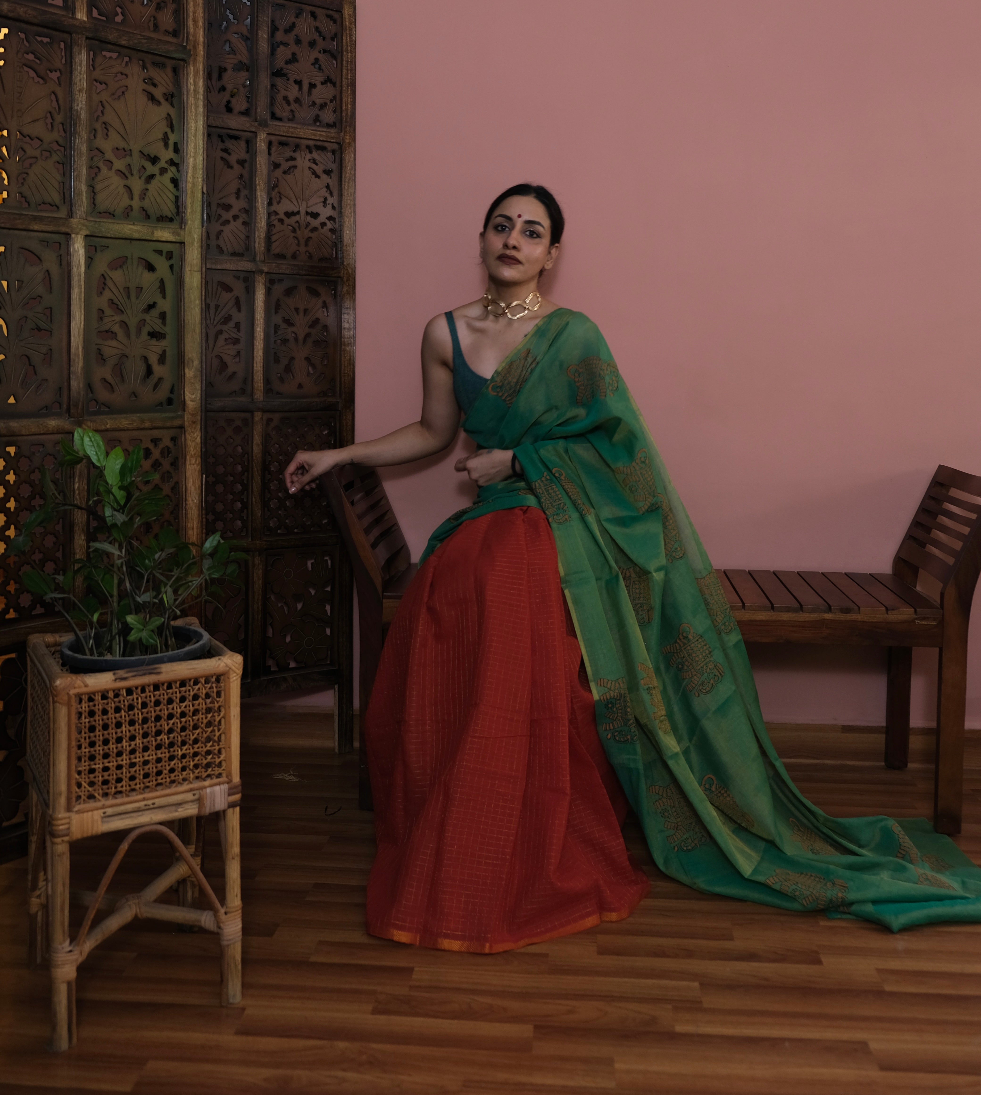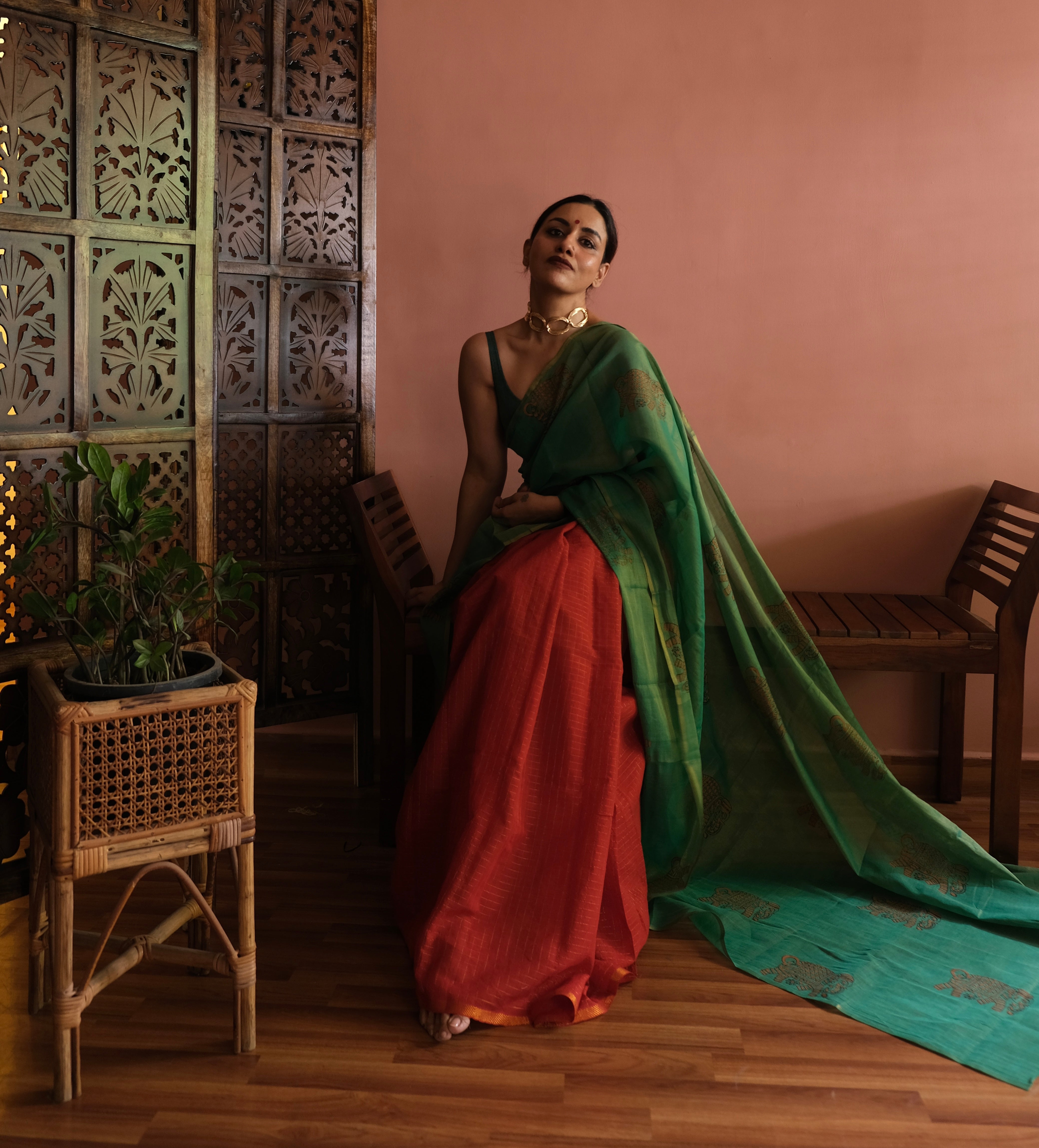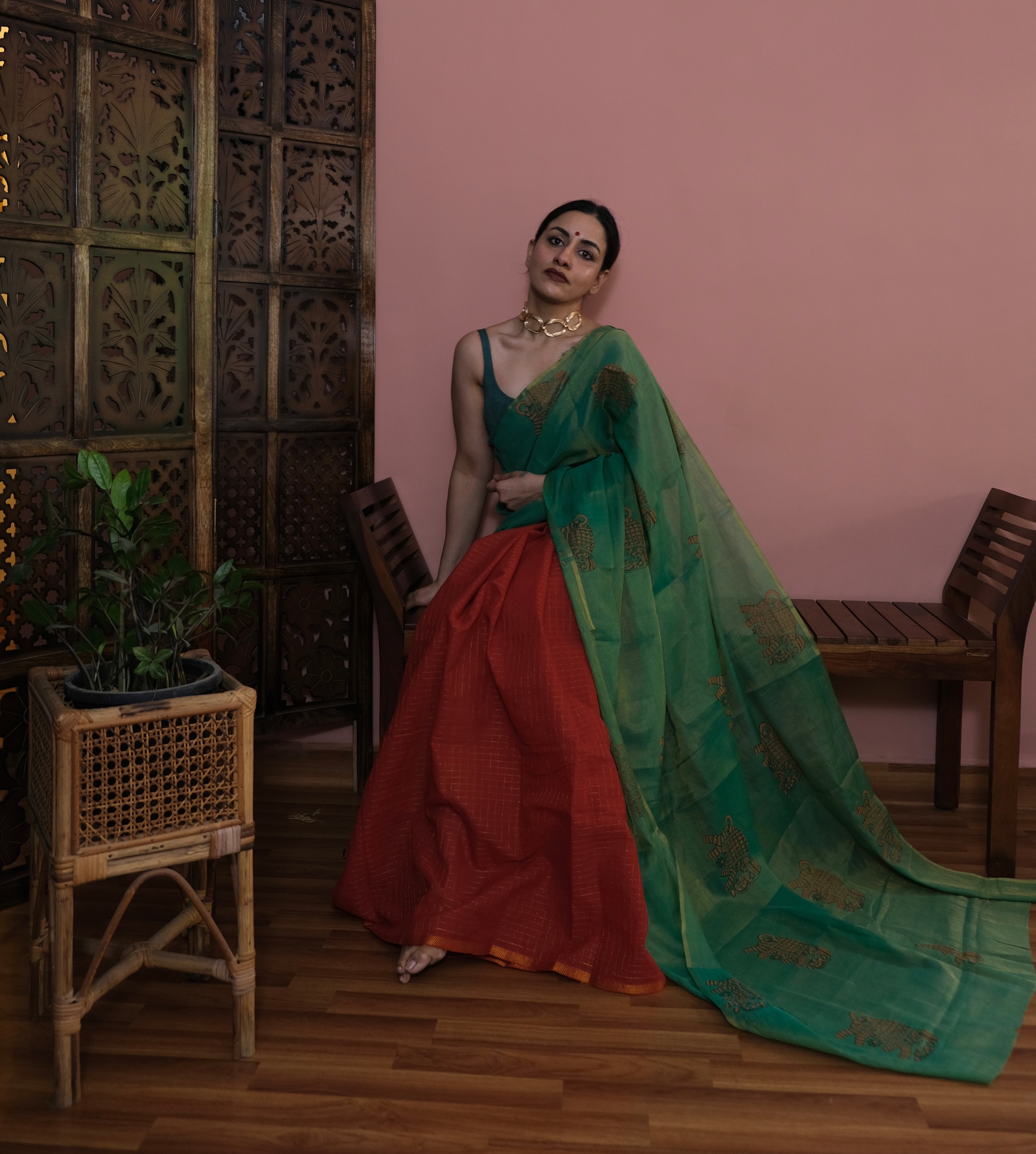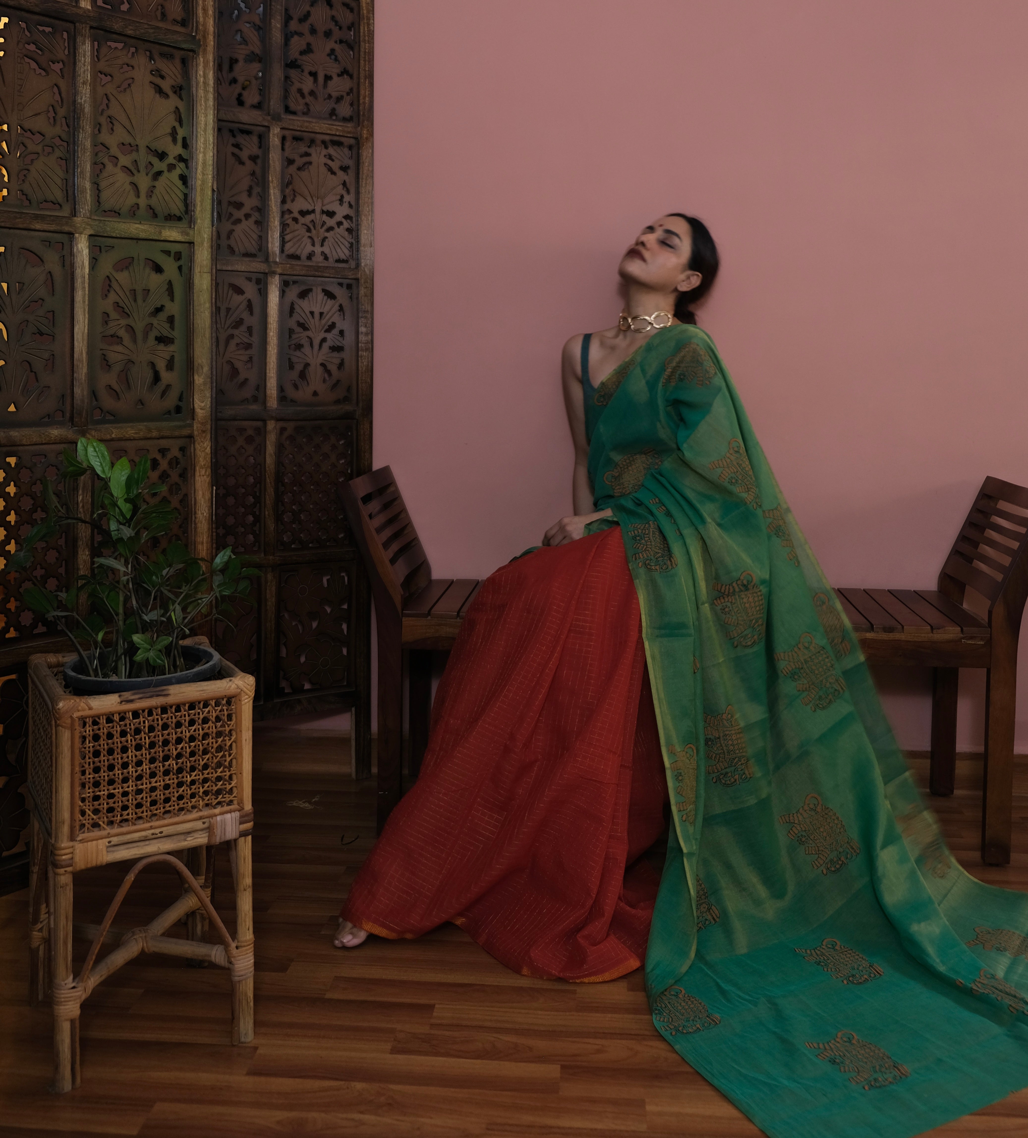 • Tissue & Cotton Half & Half Saree | Block Printed