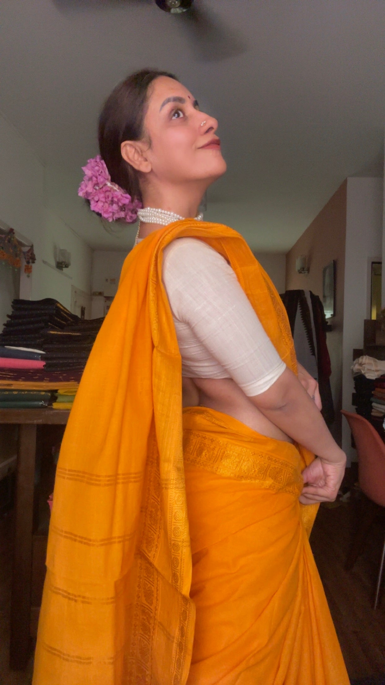 - Provided with curated blouse length (75 to 80 cms)