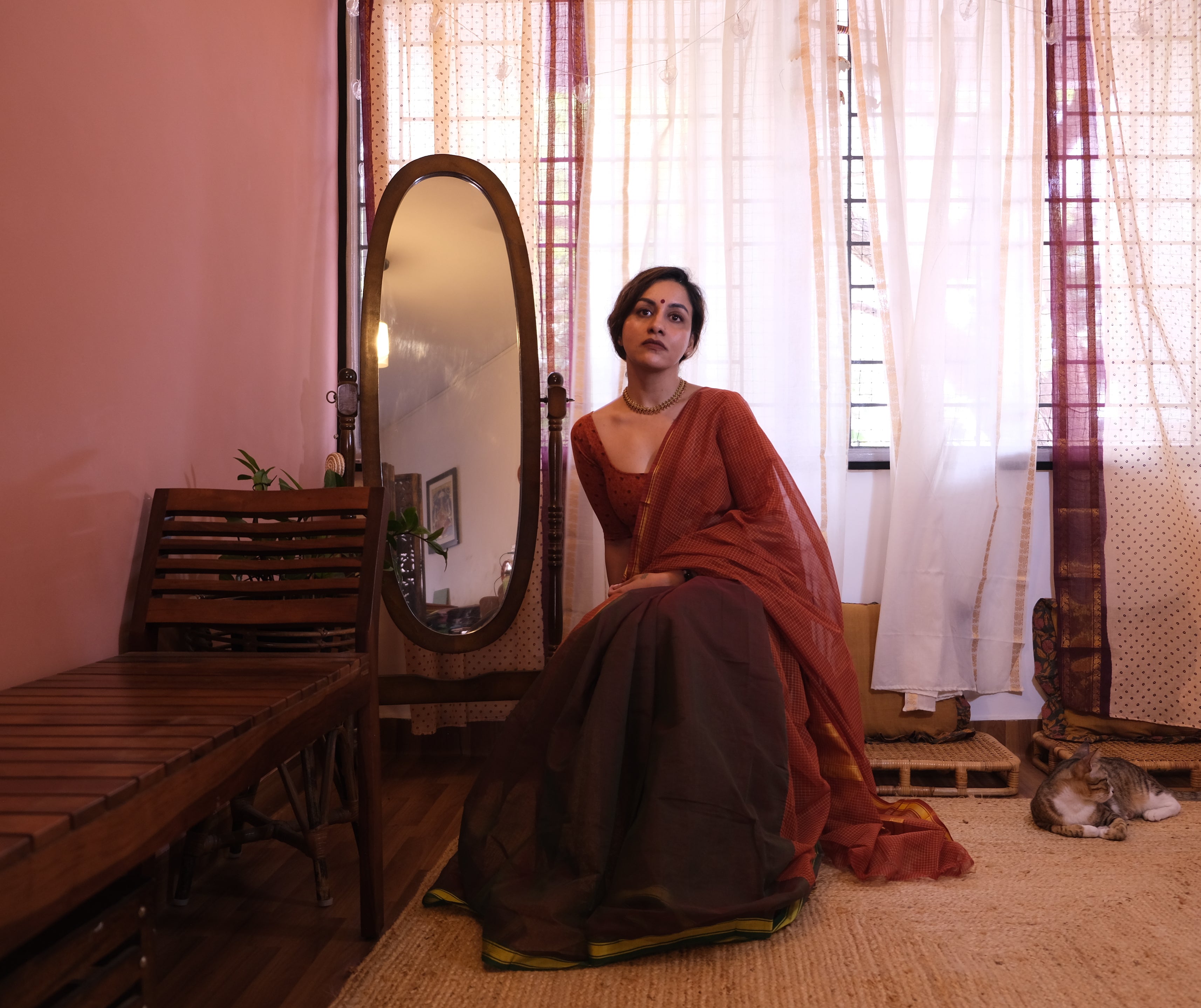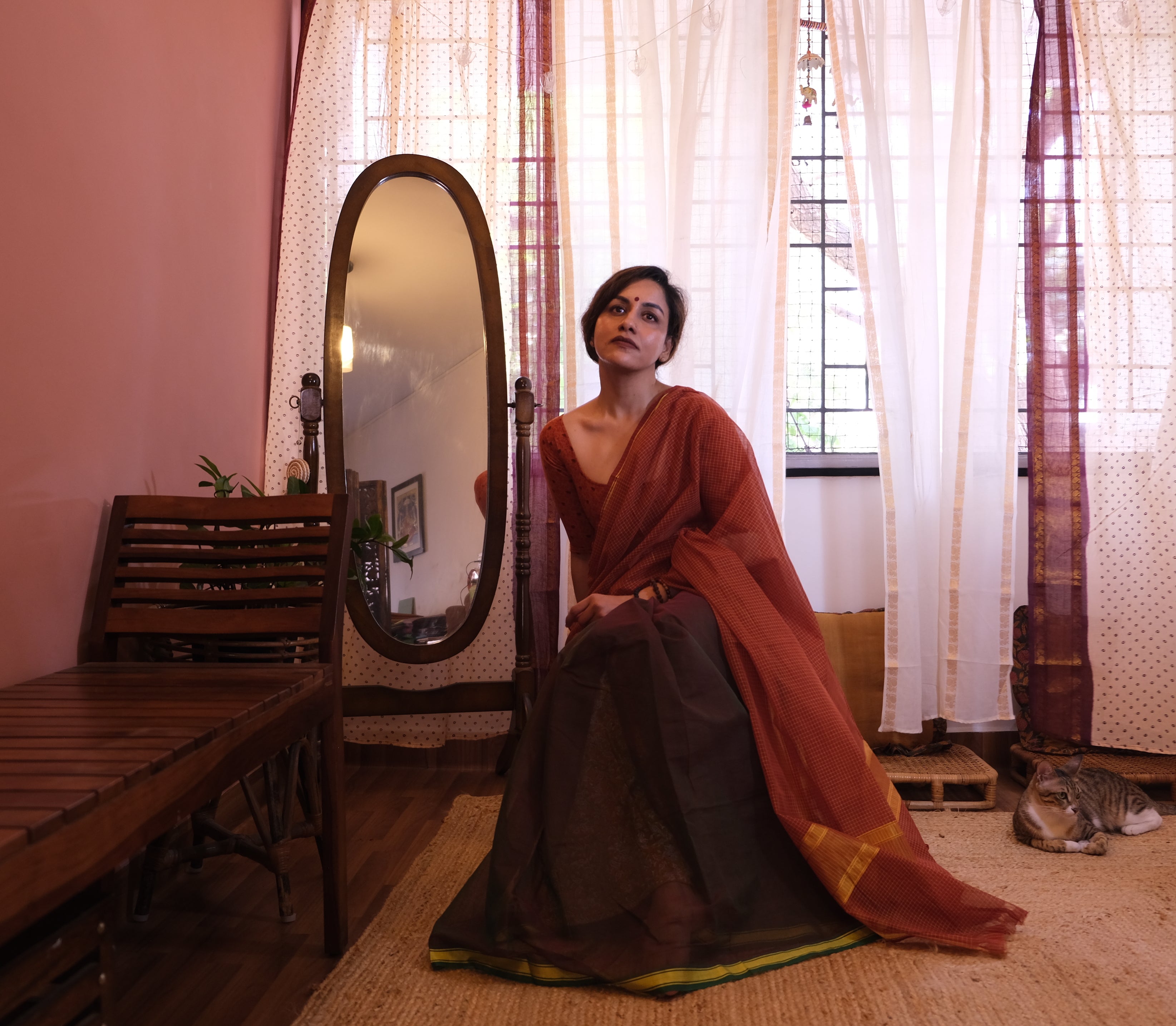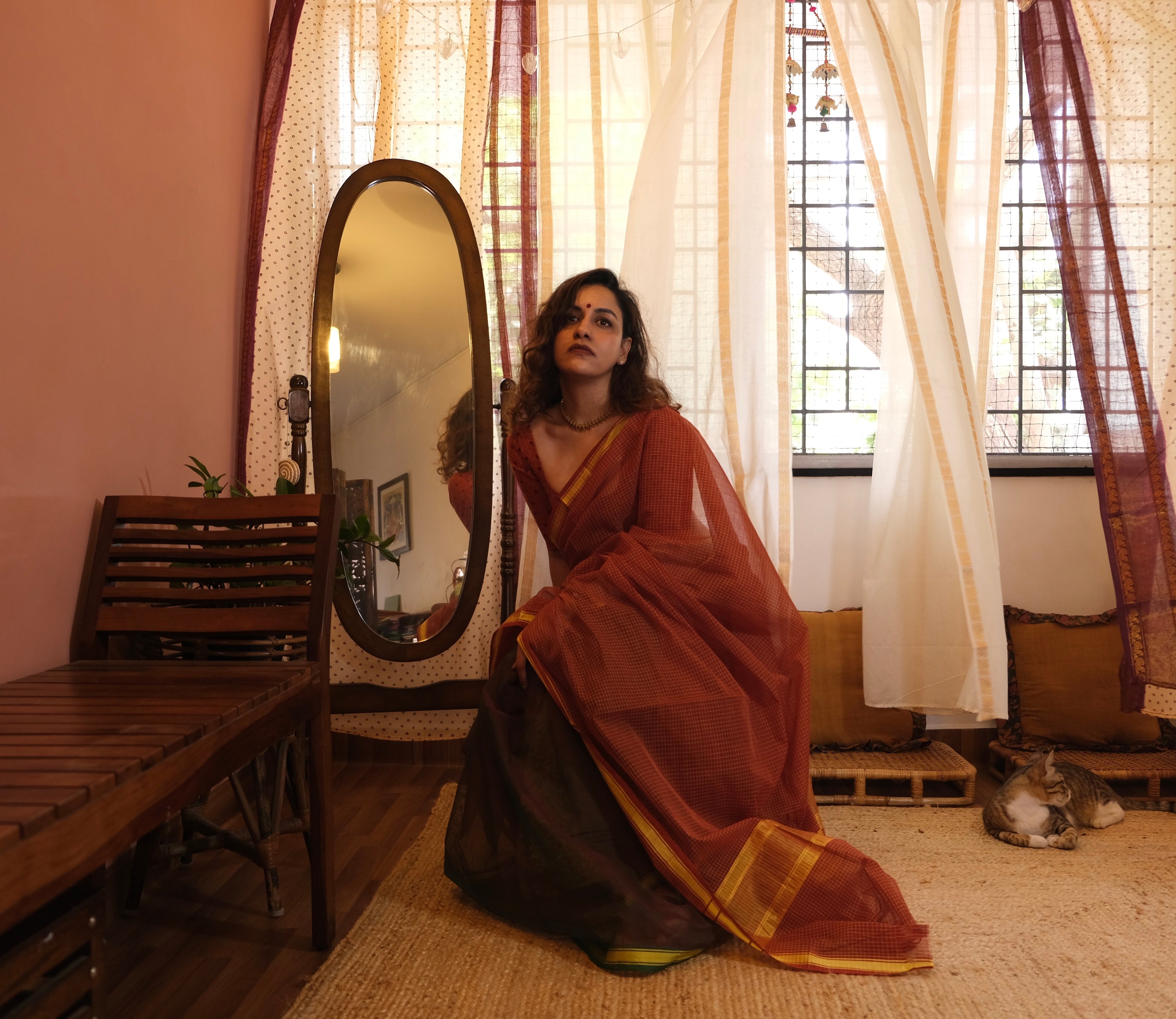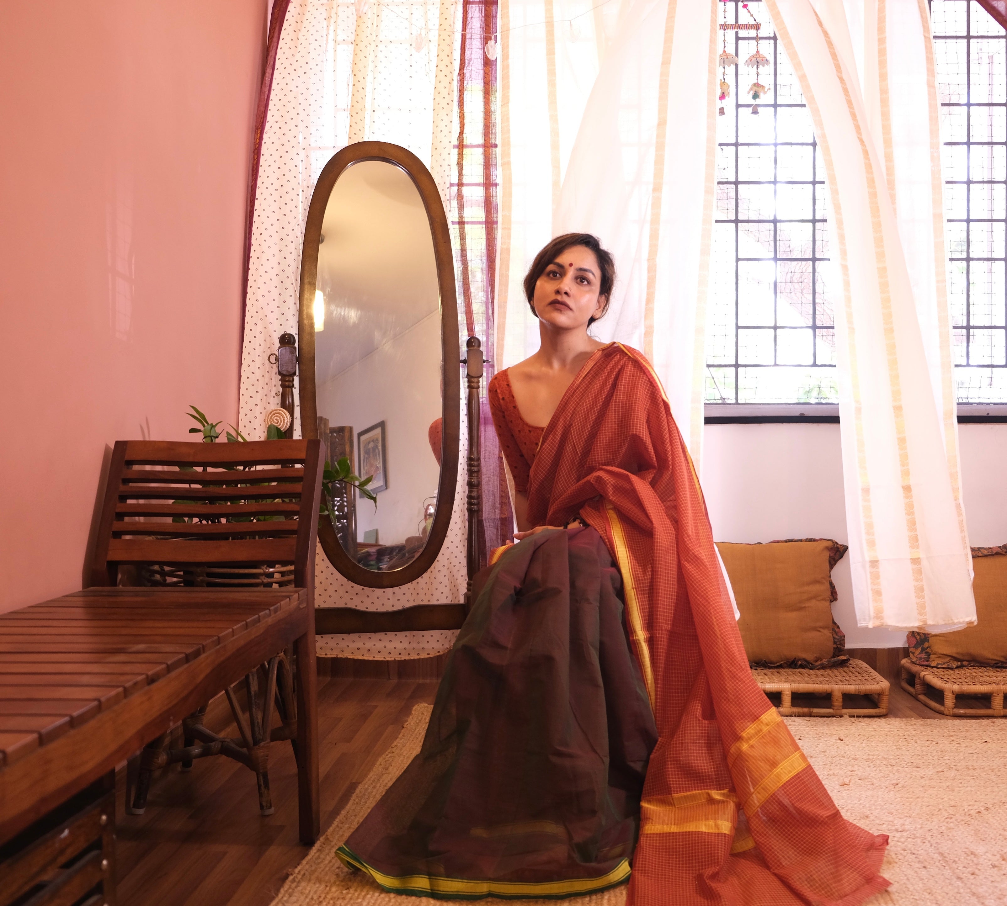 - Please note that authentic handloom cotton sarees may carry a mild earthy or oil-like fragrance due to the use of natural starching and traditional weaving processes. This is a characteristic of unprocessed textiles and typically softens after airing or a gentle wash.