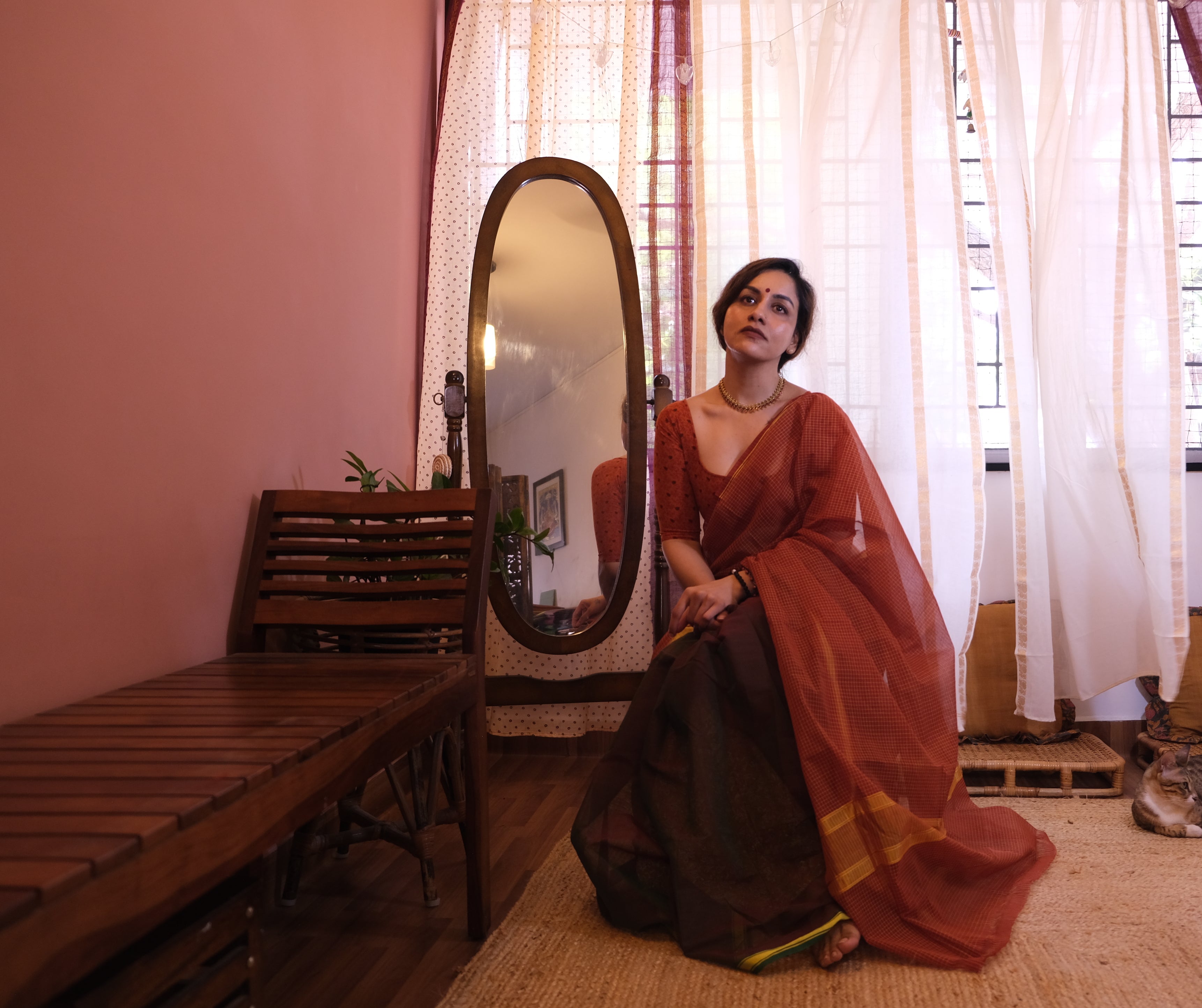- Some Laya sarees are created by joining fabrics of different heights. In these pieces, the taller fabric has been folded to align with the shorter one. This fold remains tucked in at the waist when draped and does not affect the look or flow of the saree. The construction is intentional, allowing each fabric to retain its character while bringing the design together.