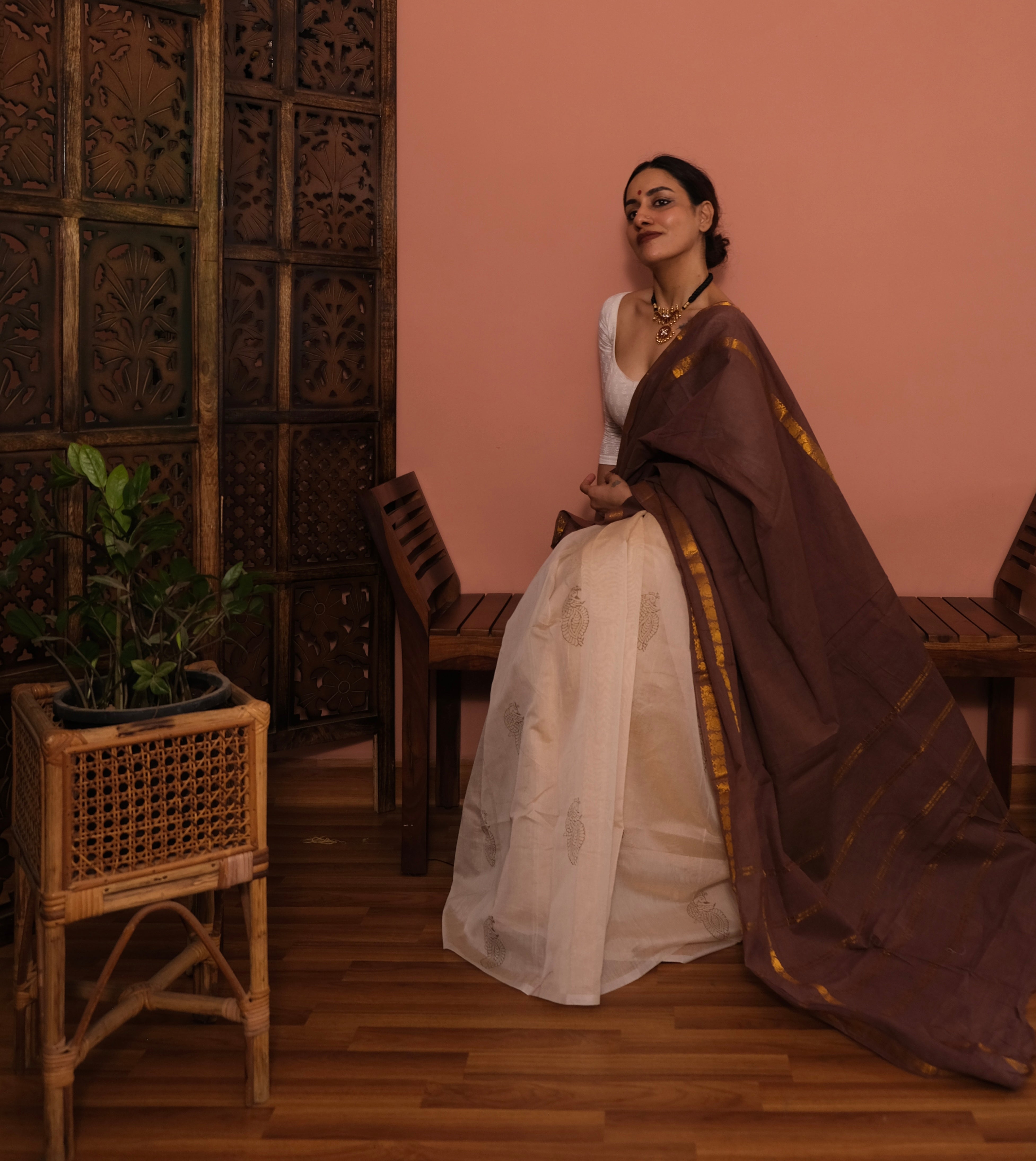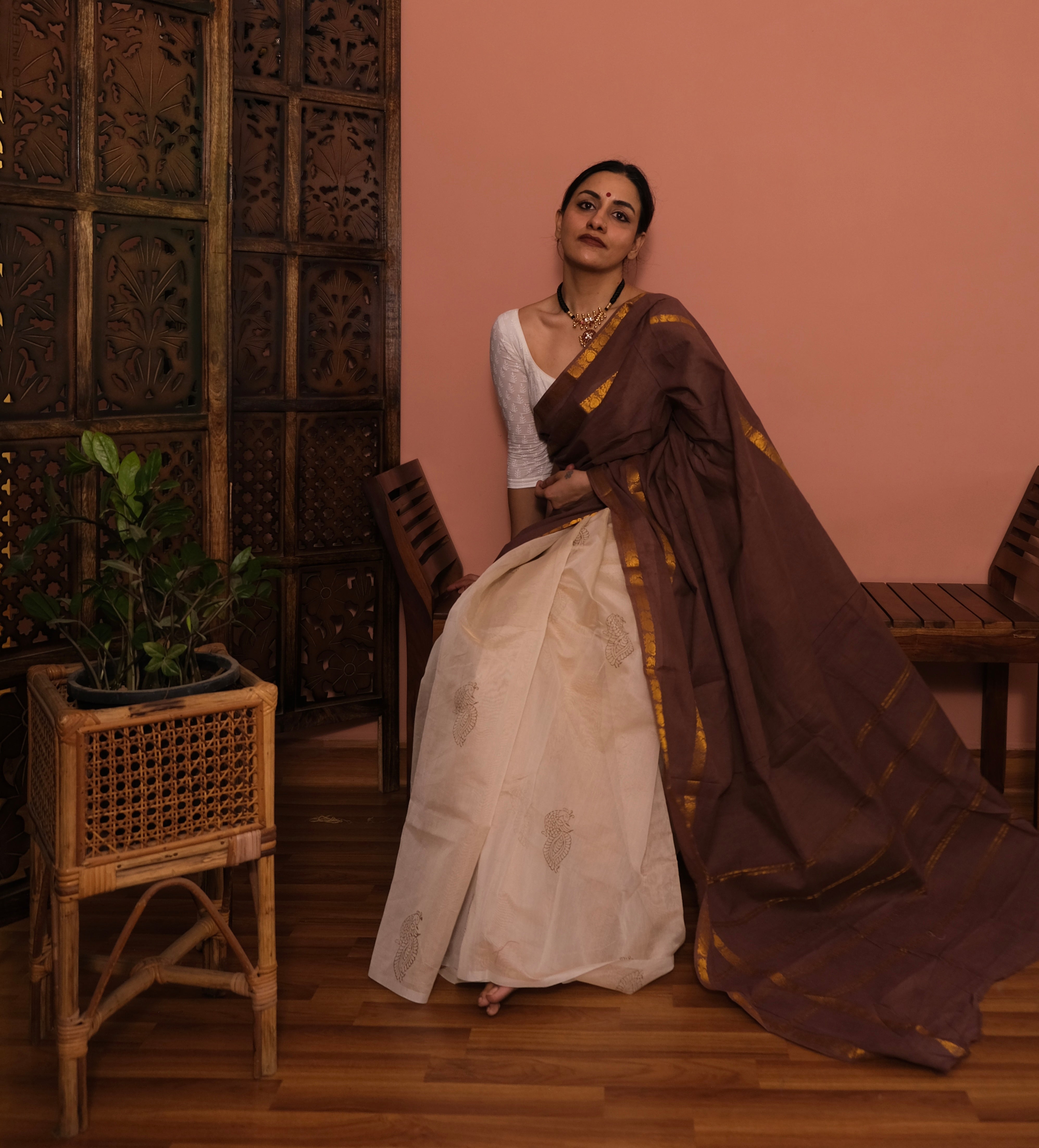 - Brown Cotton Pallu | Cream Checkered Pallu | No Borders