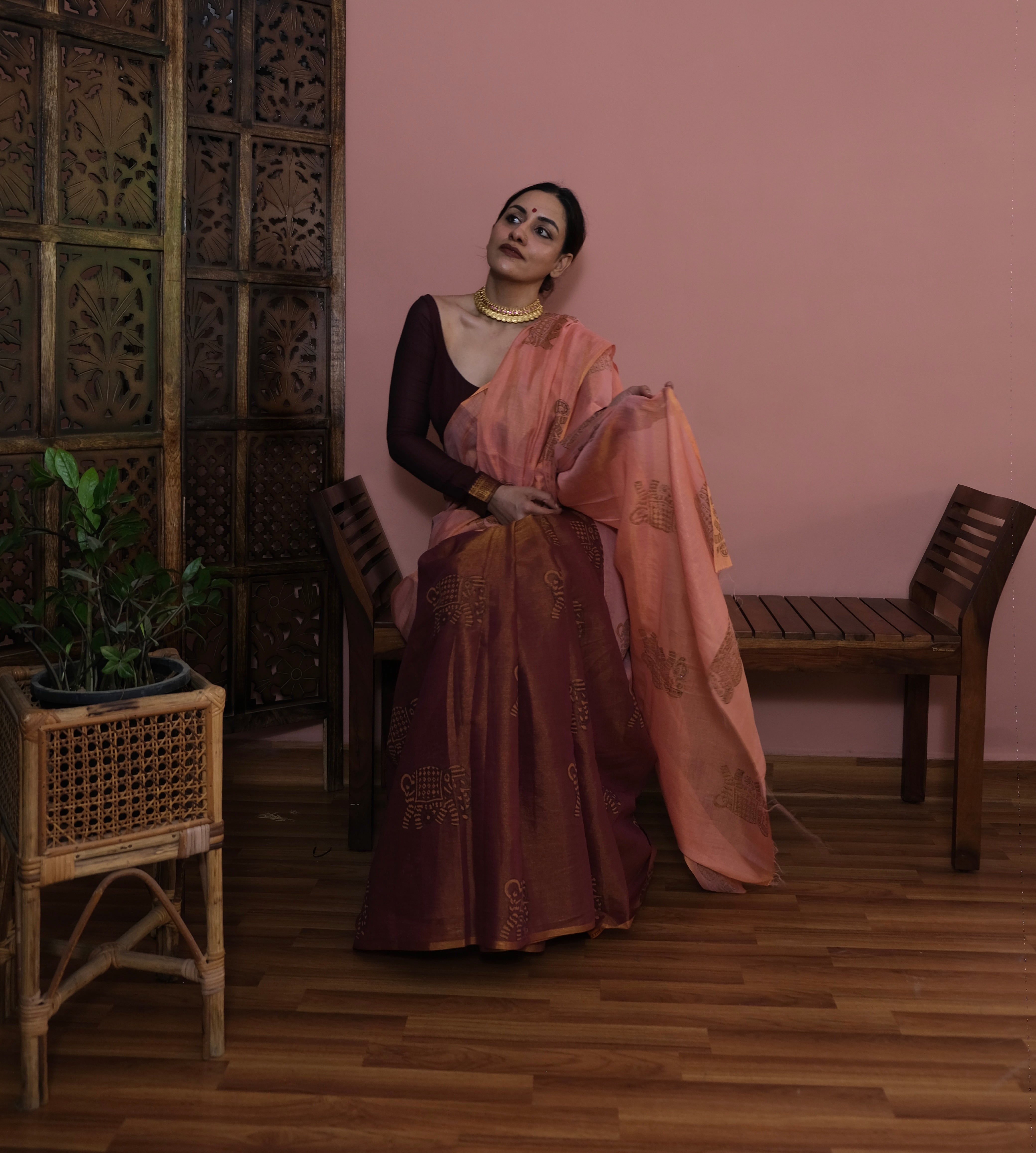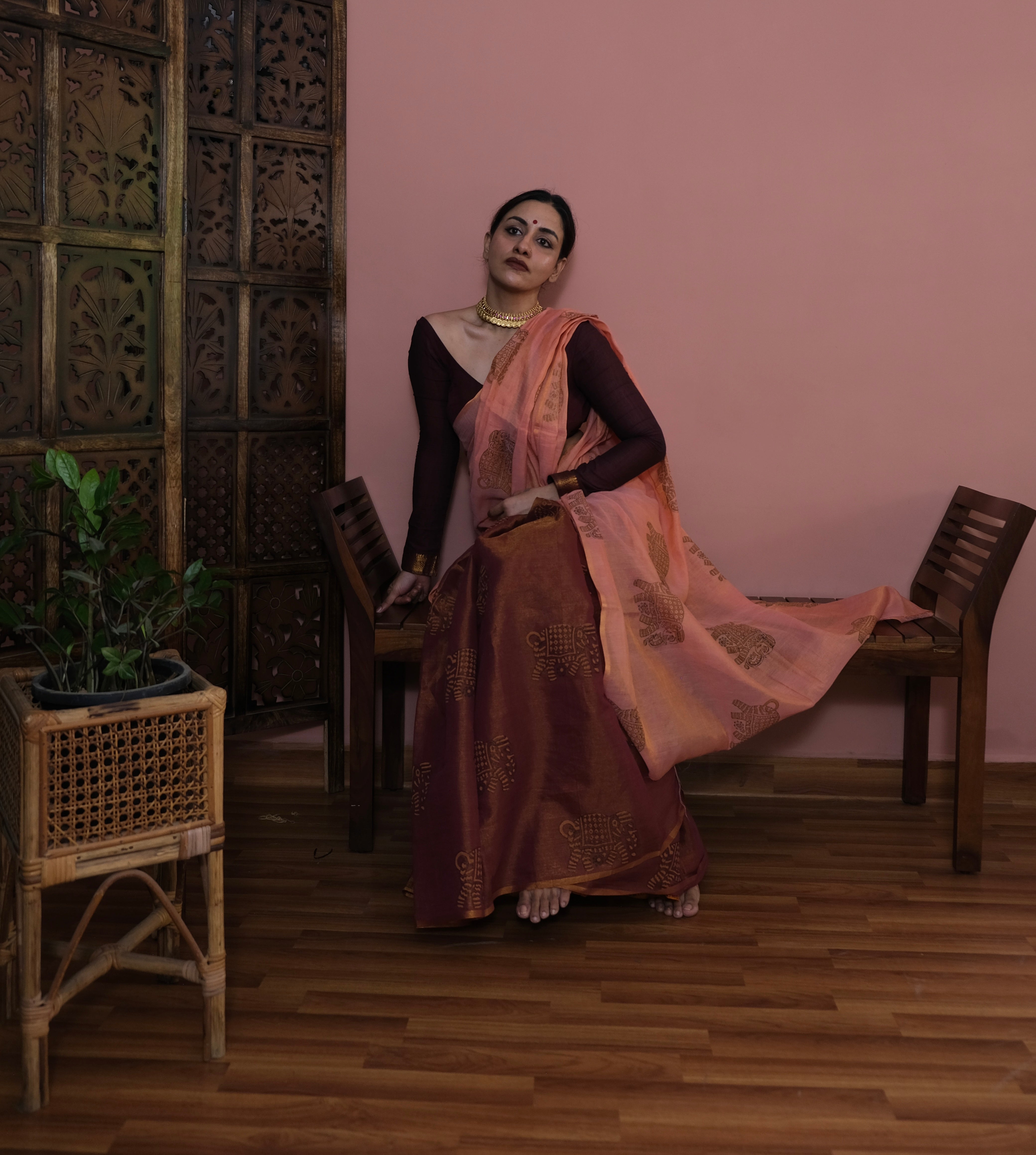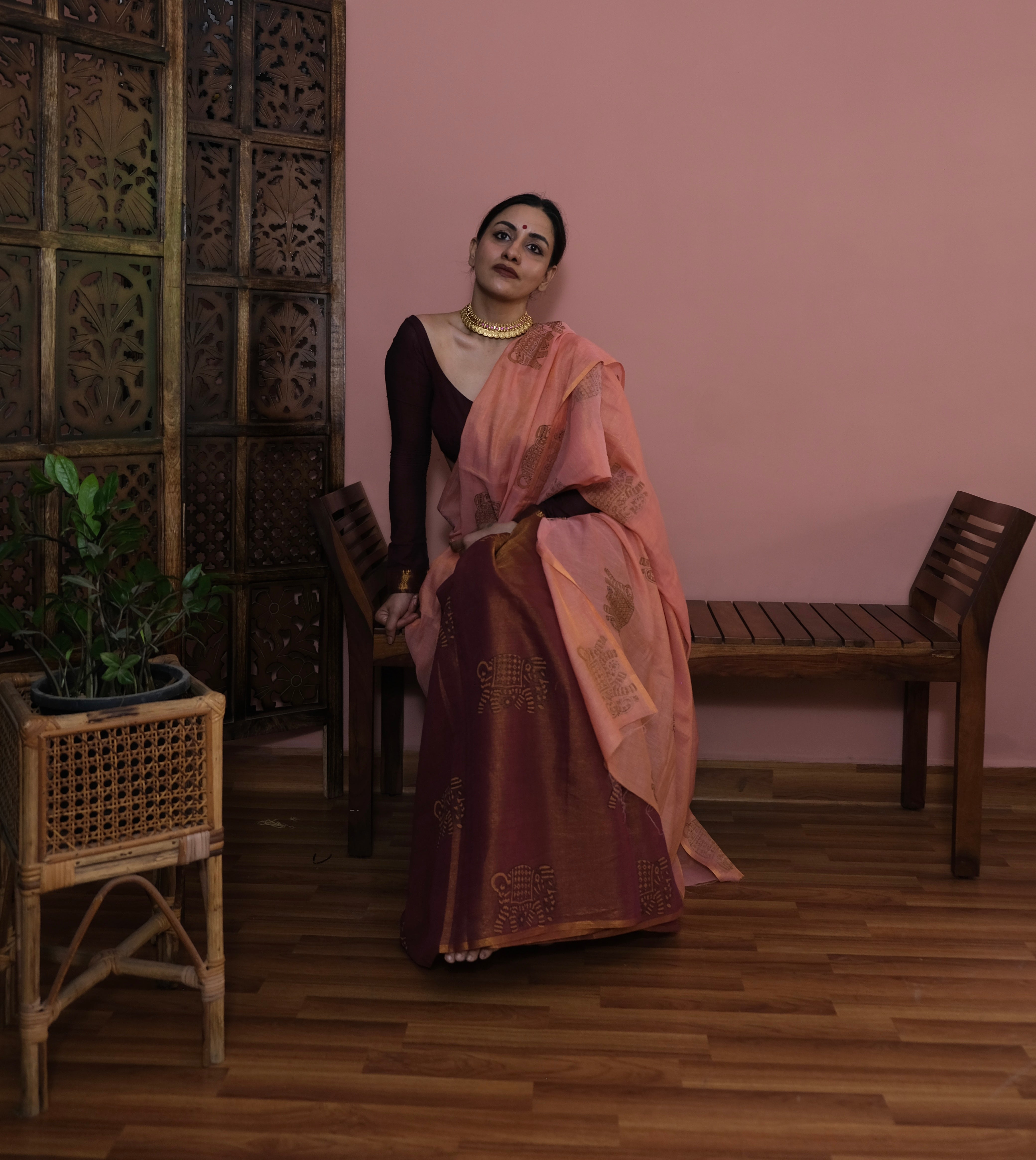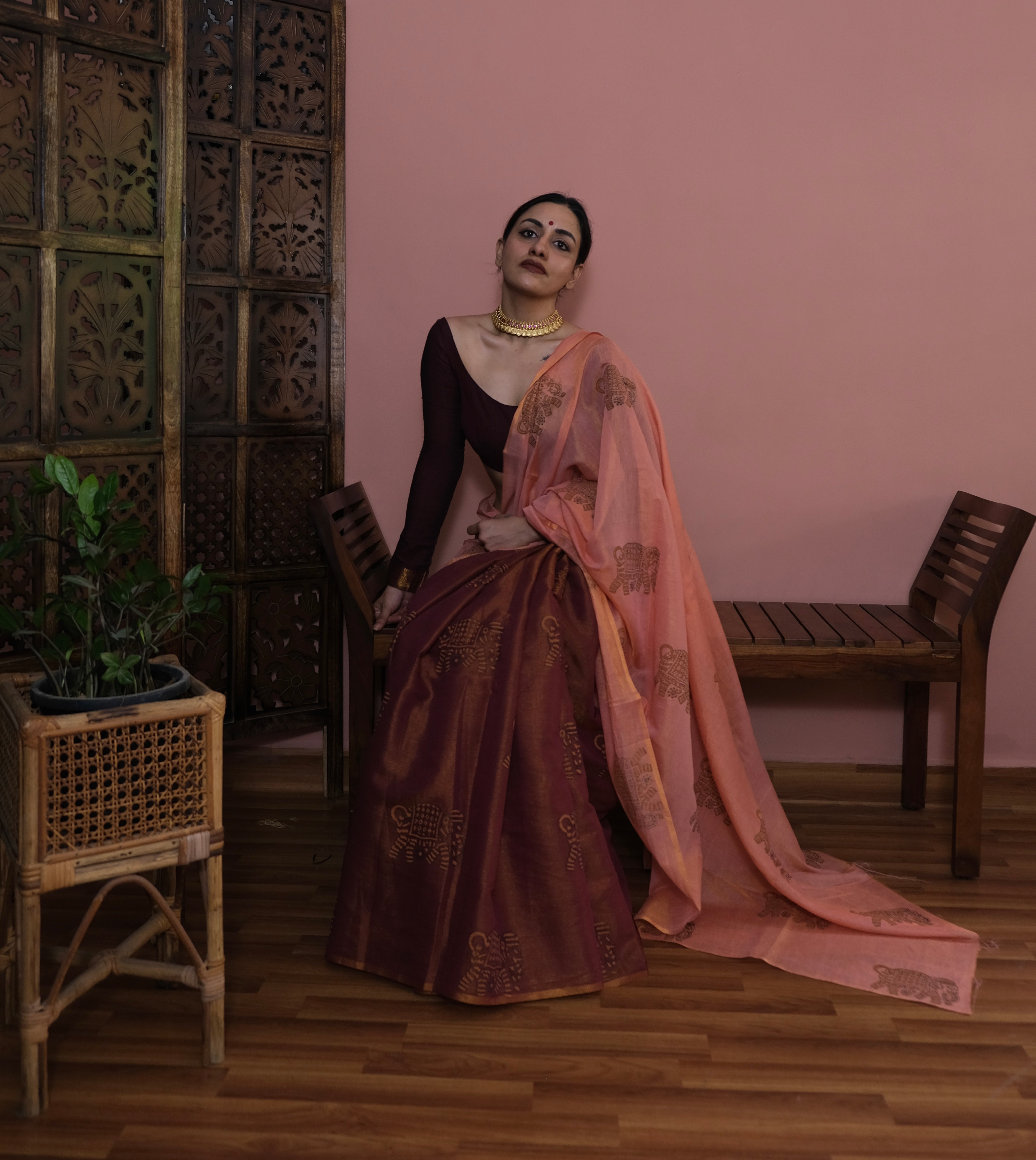 - Peach Pallu | Redish Brown Body